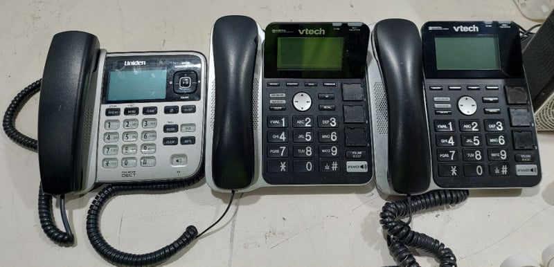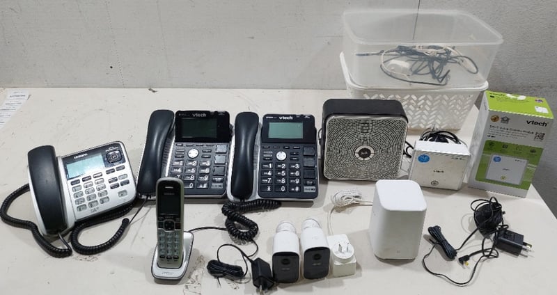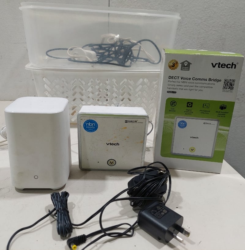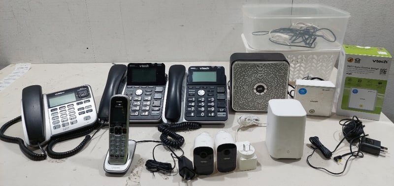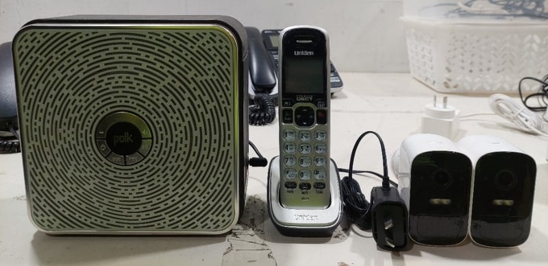 Assorted electronic equipment including VTech and Uniden telephones, Polk Audio Camden Square Bluetooth Wireless Speaker, VTech DECT Voice Comms Bridge and more...Sold as a lot.Note: items are untested, signs of wear.