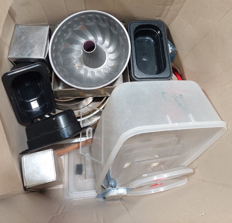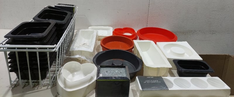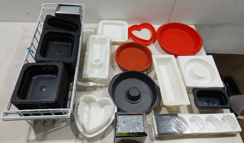 Assorted kitchenware including, Non Stick Ring Cake Pan along with various silicone baking molds, plastic food containers and more... Sold as a lot. Note: signs of wear.