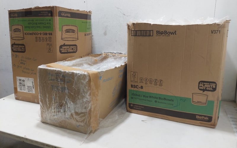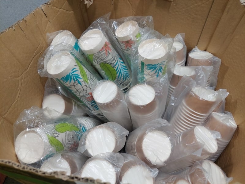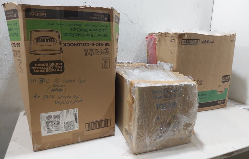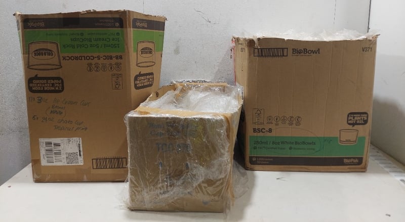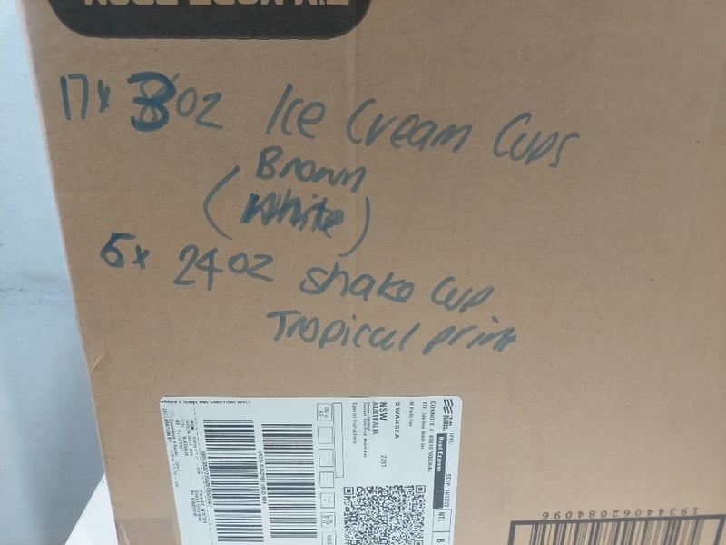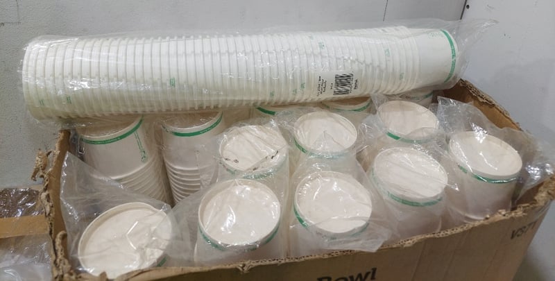 Assorted lot of cups includes 3oz, 8oz ice cream cups, 70ml pp sauce cups and Lids and24 oz shake cups.Sold as lot. Notes: signs of wear.