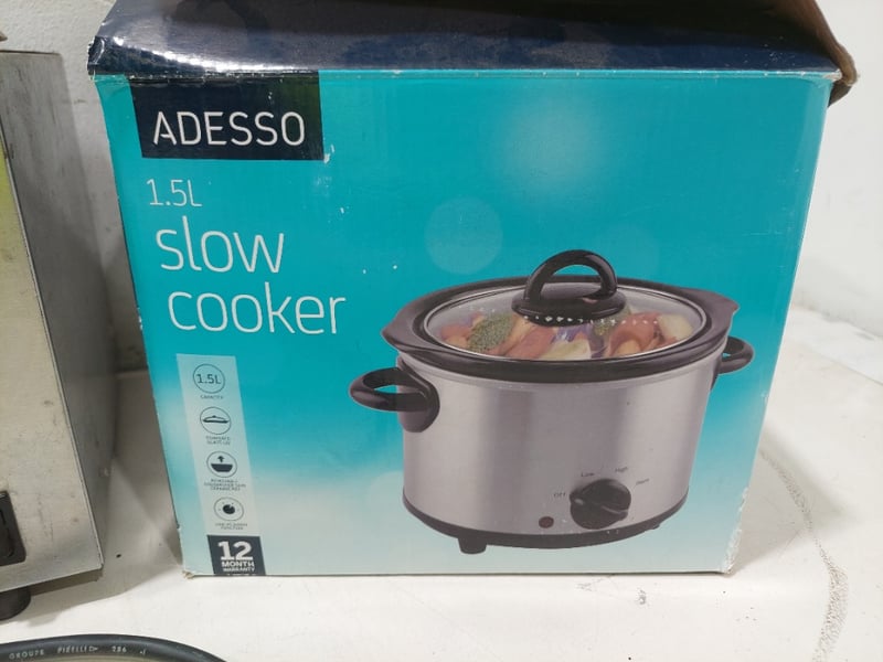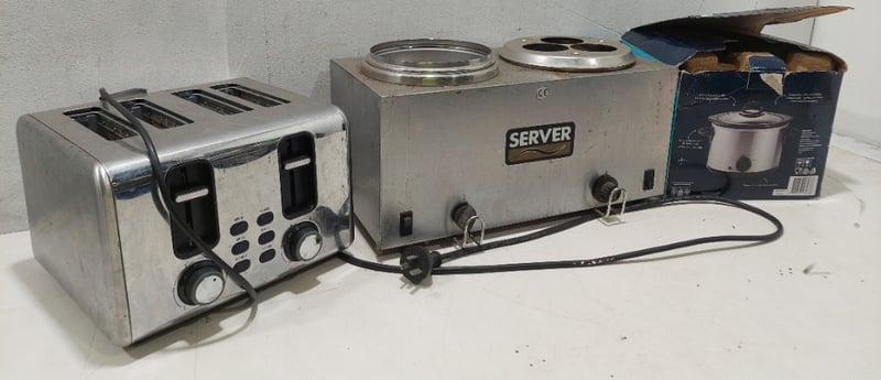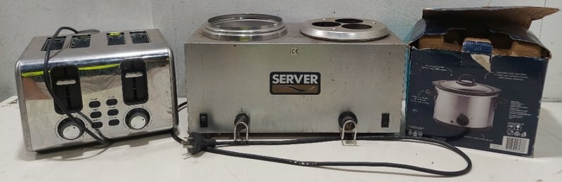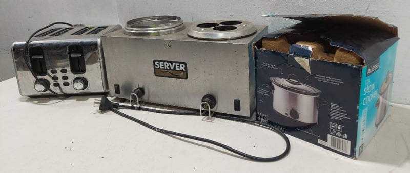 Assorted lot of catering equipment includes, Anko toaster, Server food Warmer and Adesso slow Cooker.Sold as lot.Notes: items untested and signs of wear