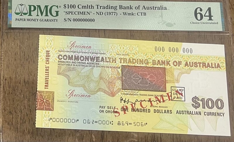1977 COMMONWEALTH TRADING BANK AUSTRALIA $100 SPECIMEN TRAVELLER CHEQUE PMG GRADED 64 UNCIRCUALTED VERY RARE ISSUE