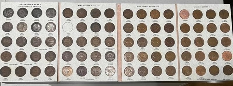 AUSTRALIA PRE DECIMAL COOPER PENNIES SET OF 79 COINS EXCEPT 1930 PENNY Deceased Estate Complete Australia Pre Decimal Cooper Pennies Set Of 79 Coins, Which Has All The Date Except 1930 Penny1925 & 1946 Pennies Both Scarce & Rare Included In This AlbumPenny Album Has Some Wear & Tear 311189+9