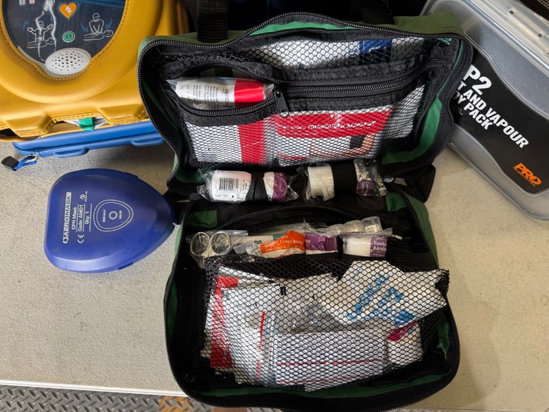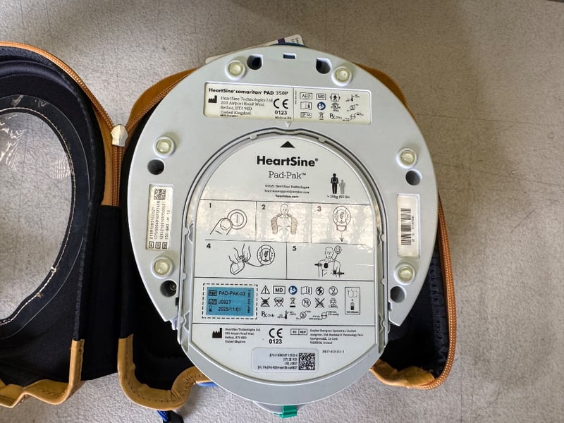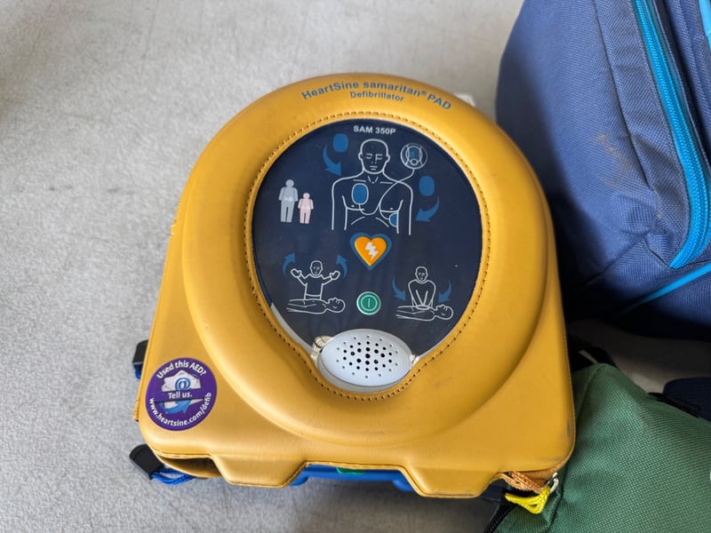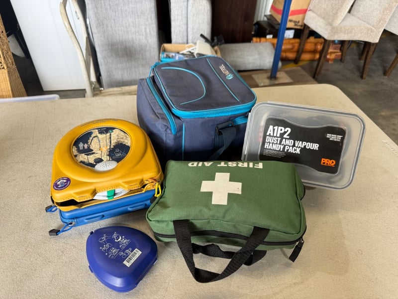 Medical supplies including defibrillator, first aid kit, CPR mask and more Note: some components may be expired, Sold as Lot