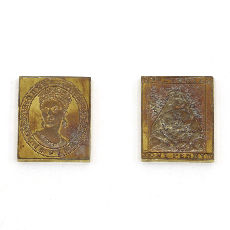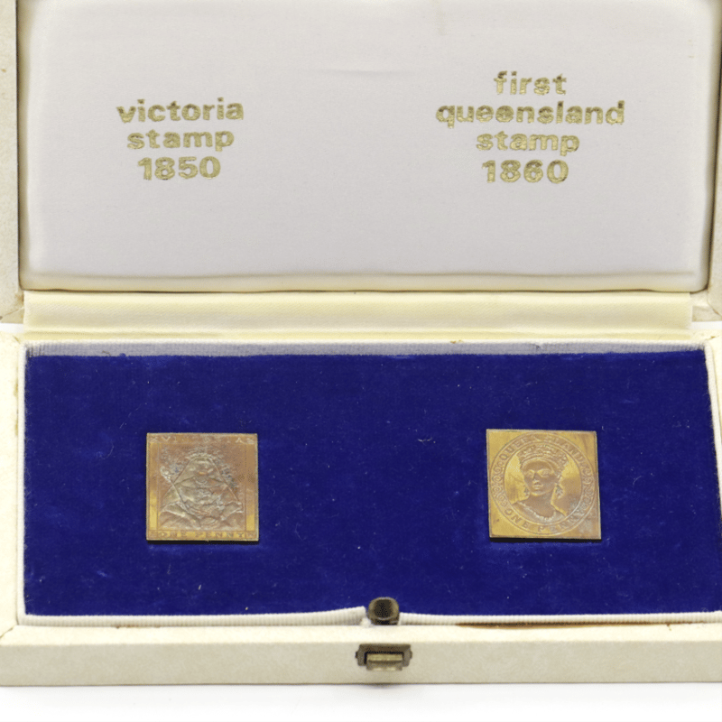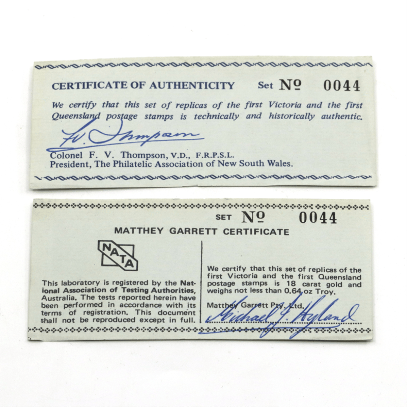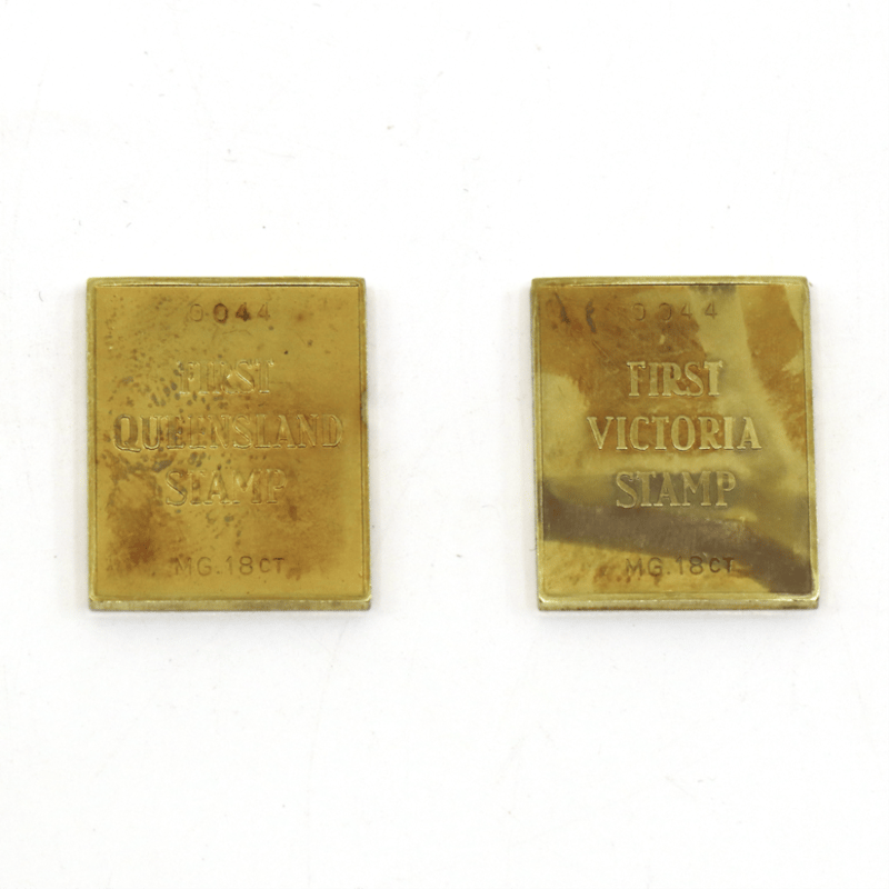 2 X 18K GOLD, 1850-1860 REPLICAS OF THE FIRST VICTORIA AND QUEENSLAND POSTAGE STAMPS.
