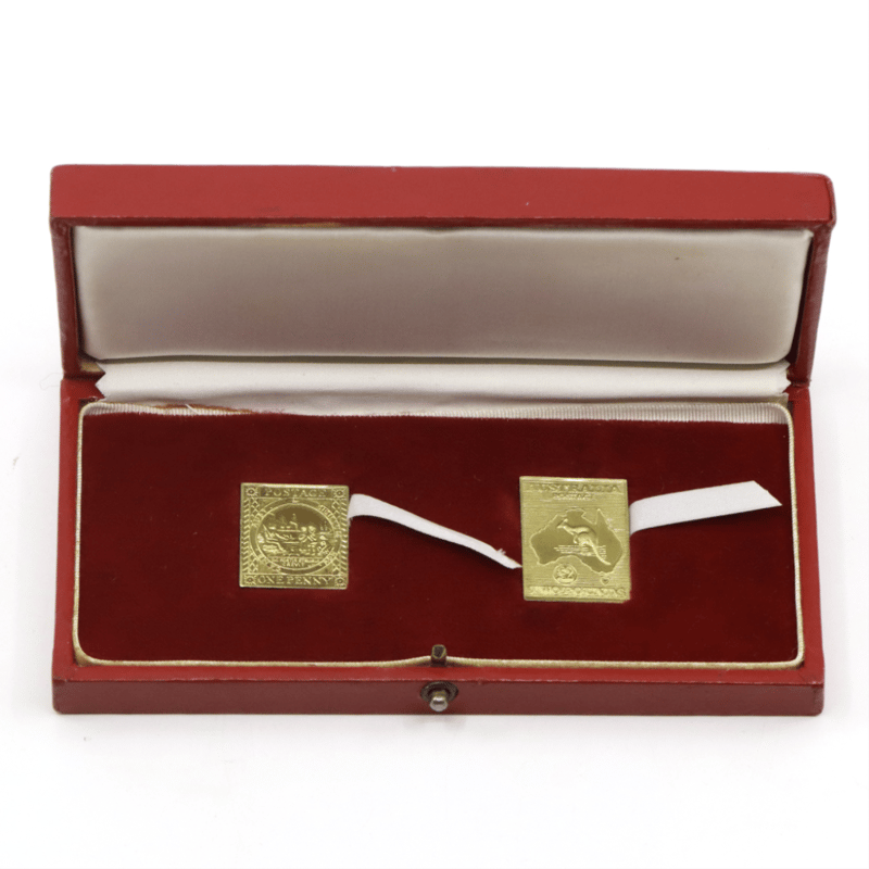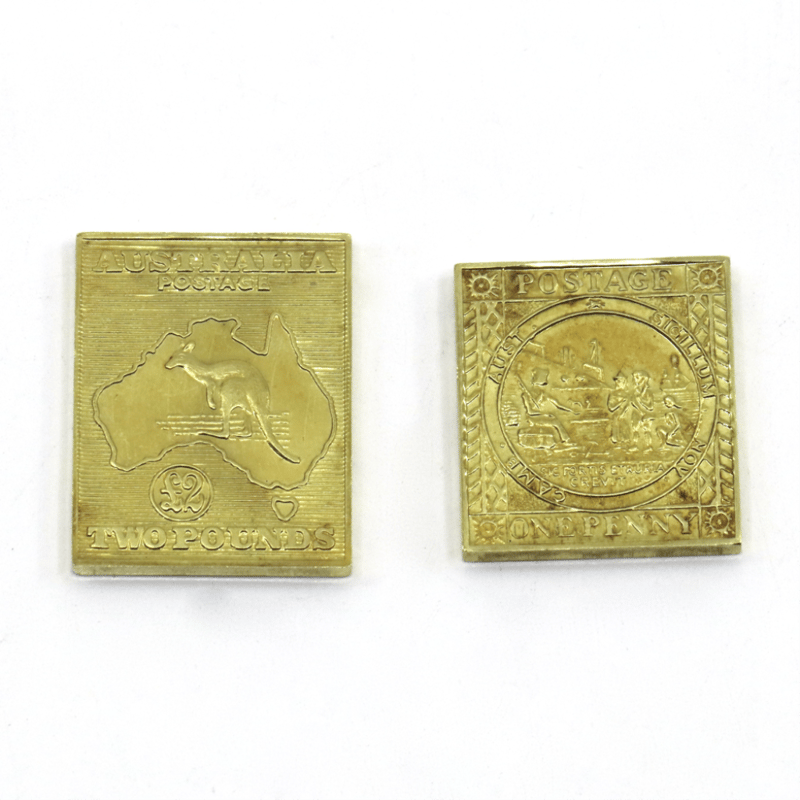 2 X 18K GOLD, 1850 NSW SYDNEY ONE PENNY 'VIEW' REPLICA AND 1913 AUSTRALIA £2 'KANGAROO' REPLICA POSTAGE STAMPS.