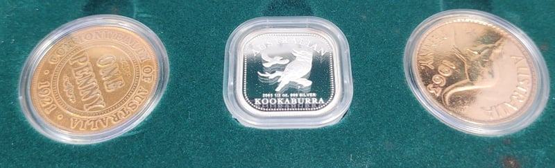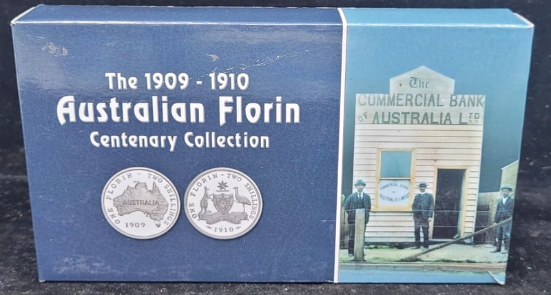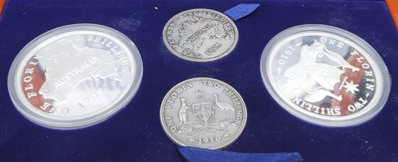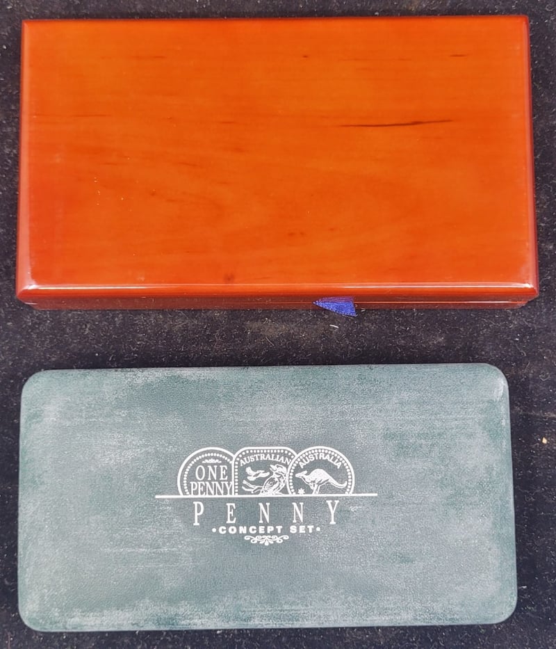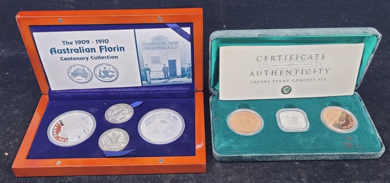 ASSORTED AUSTRALIAN COINS 1909 - 1910 Australian Florin Centenary Collection Two Shillings, Square Penny Concept Set, 1921 One Penny, 1963 Penny 582940+4