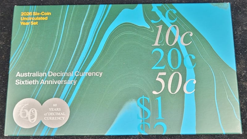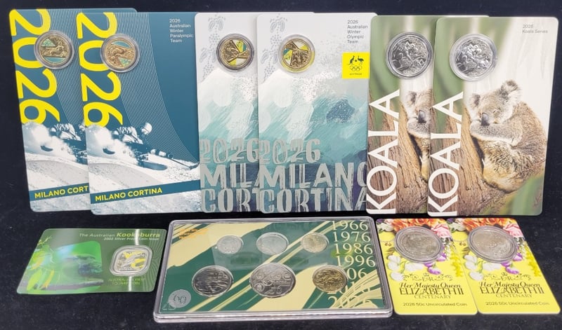 2026 Six Coin Australian Decimal Currency Sixtieth Anniversary Set, 2026 50C Koala Series Coin, 2026 $1 Australian Winter Olympics Coin, 2026 $1 Australian Winter Paralympic Coin, 2026 50C Her Majesty Queen Elizabeth Ii Centenary Coin, 2002 50C Kookaburra Australia'S First Square Coin