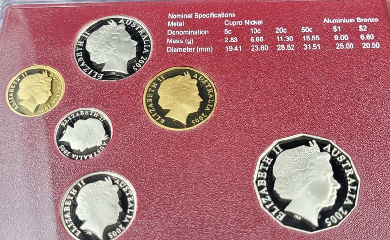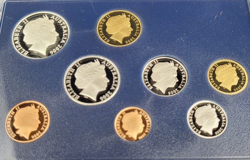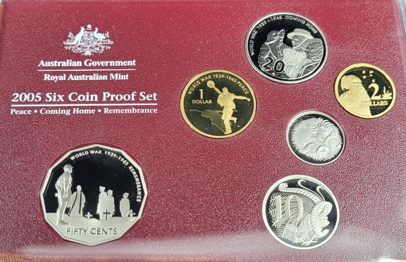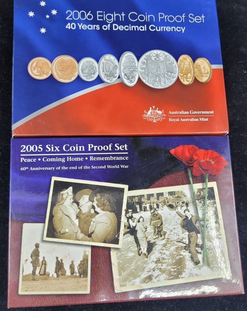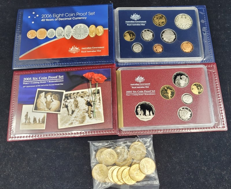 2006 Eight Coin 40 Years Of Decimal Currency, 2005 Six Coin Peace, Coming Home, Remembrance 60Th Anniversary Of The End Of The Second World War, 2025 $1 Aussie Big Things Coins