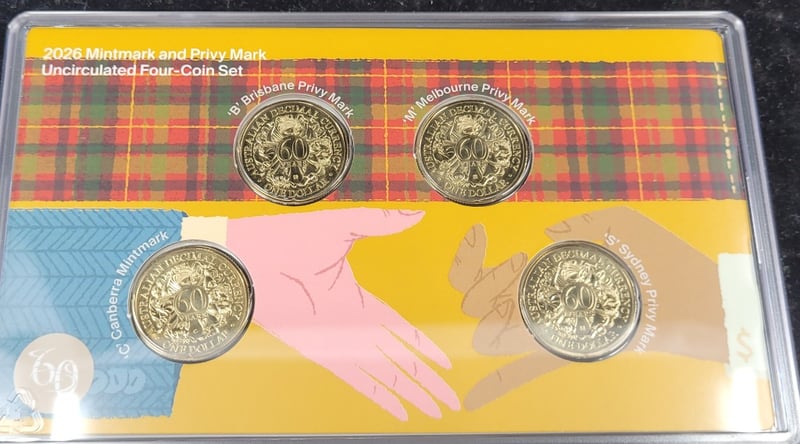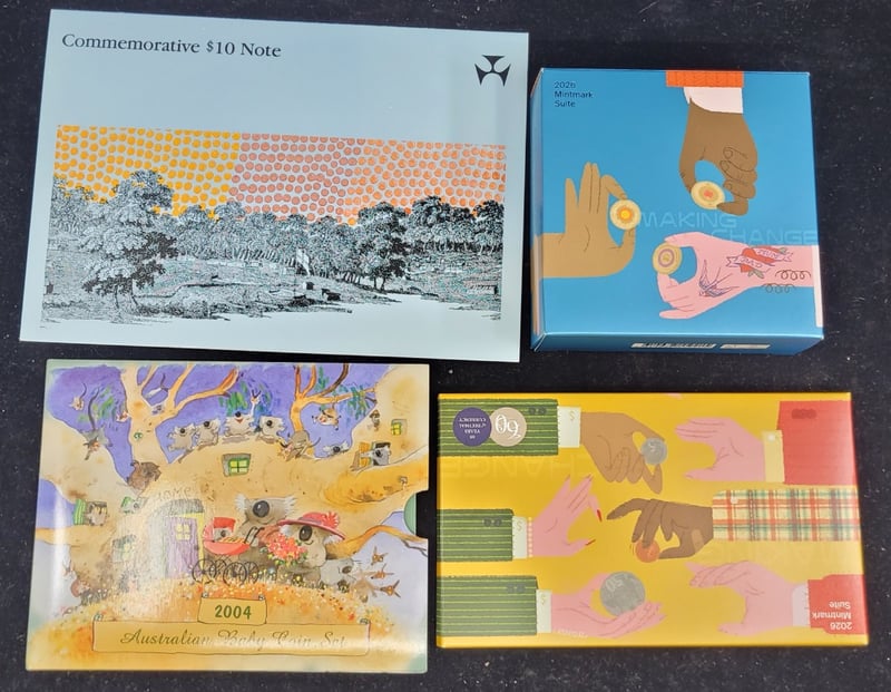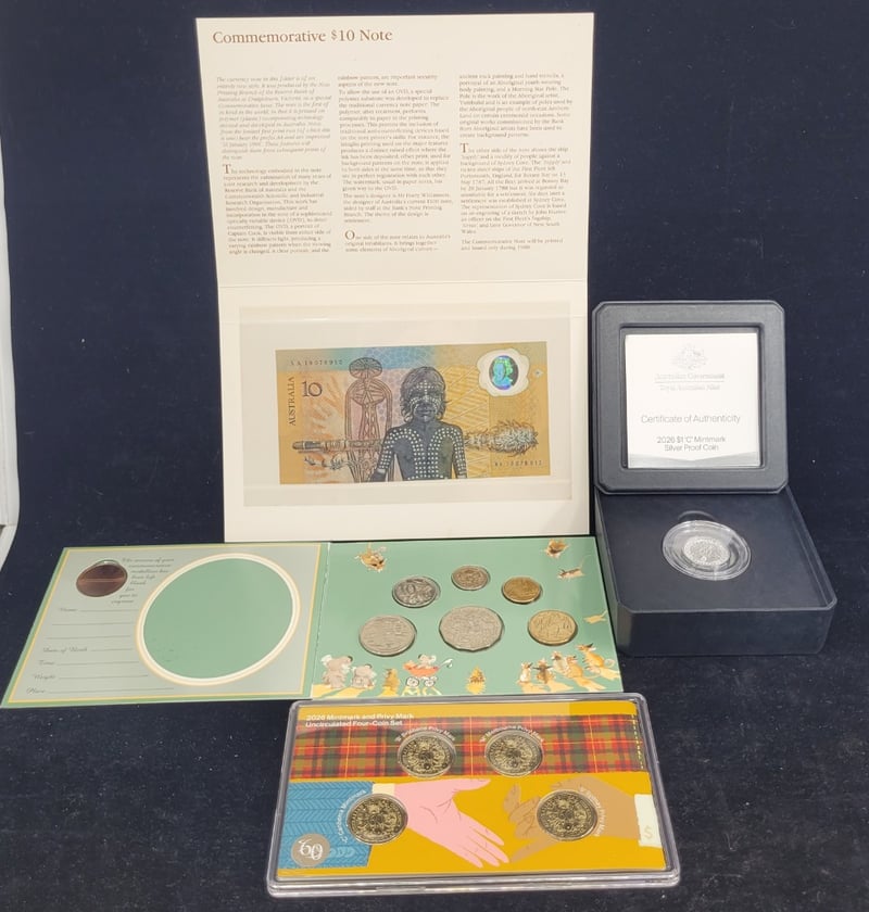 ASSORTED AUSTRALIAN COINS Commemorative $10 Note, 2004 Six Coin Australian Baby Set, 2026 Four Coin 60 Years Of Decimal Currency, 2026 $1 Silver 'C' Mintmark Coin 582940+22