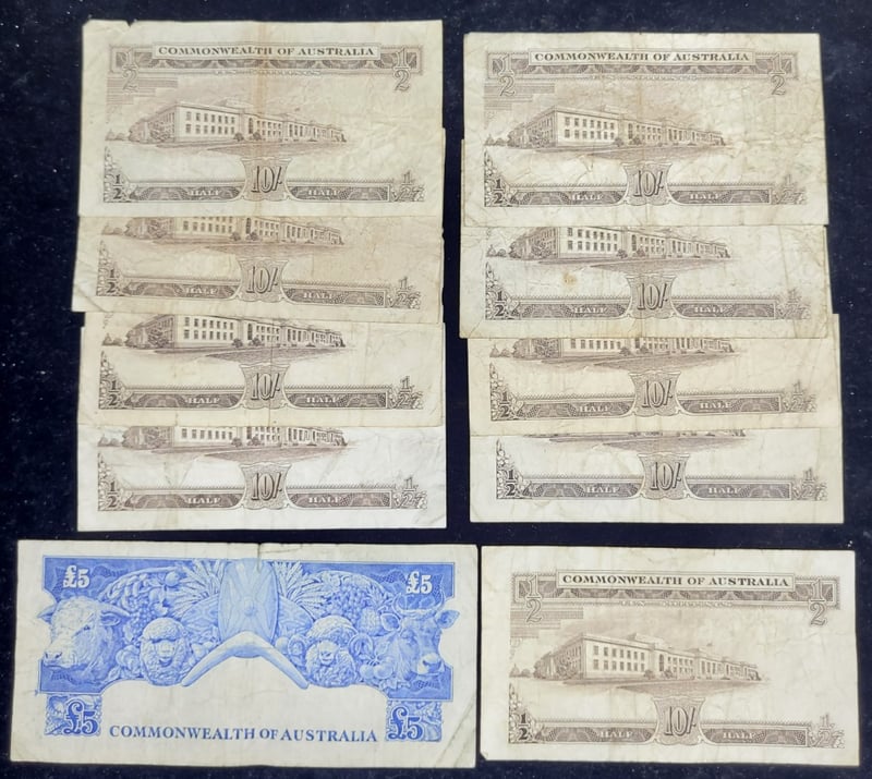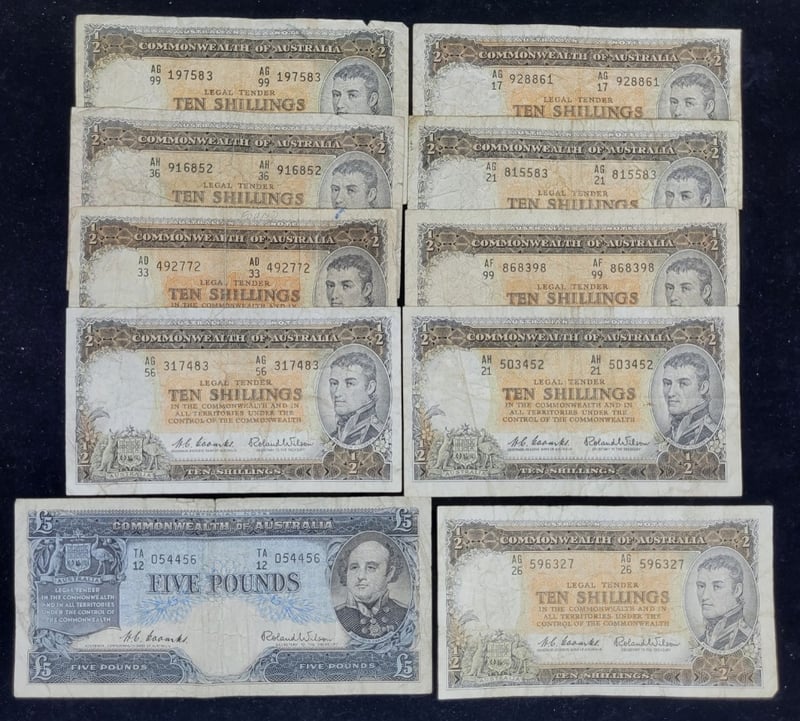 AUSTRALIAN NOTES Nine Ten Shillings, Five Pounds Bank Notes 582940+50