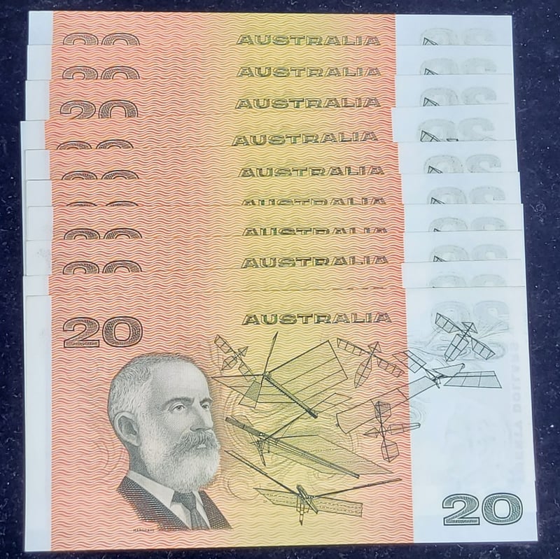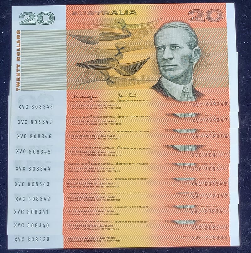 AUSTRALIAN NOTES Ten $20 Consecutive Knight & Stone Gothic Serial Unc Catalogue 582940+38