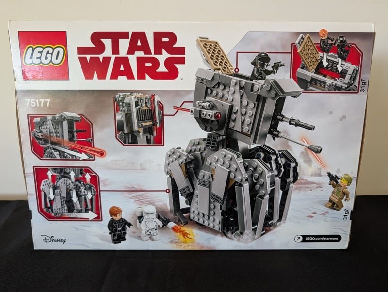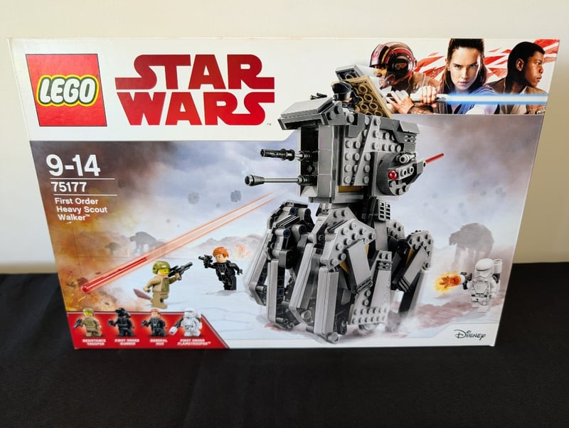 Lego Star Wars Set 75177 Featuring The First Order Heavy Scout Walker Buildable Vehicle From The Sequel Trilogy. The Set Includes Four Minifigures (First Order Stormtrooper, First Order Officer, Resistance Soldier, And First Order General), A Buildable Walker With Articulated Legs And Rotating Turret, Removable Cockpit Section, And Action Elements Including Spring-Loaded Shooters. Suitable For Ages 9-14. Box Displays Original Artwork And Disney Branding. Appears Complete With Original Packaging