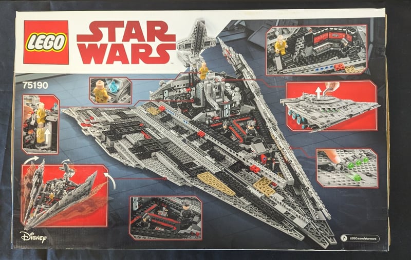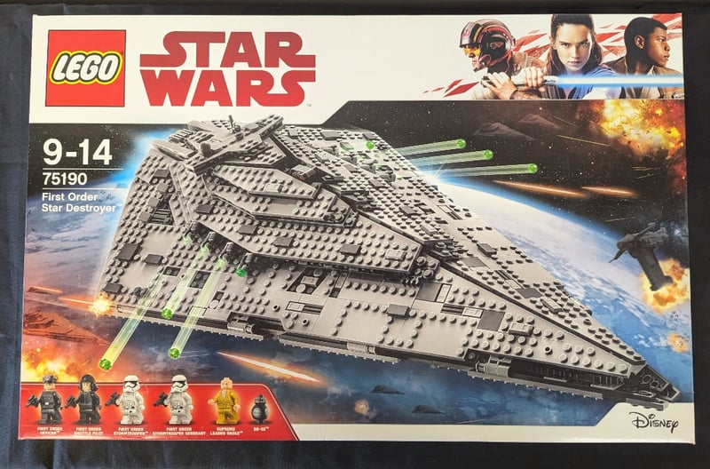 Lego Star Wars First Order Star Destroyer (Set 75190) For Ages 9-14. Features A Detailed Grey And Black Star Destroyer With Firing Green Stud Blasters, Articulated Wings, And An Opening Command Bridge. Includes 6 Mini-Figures