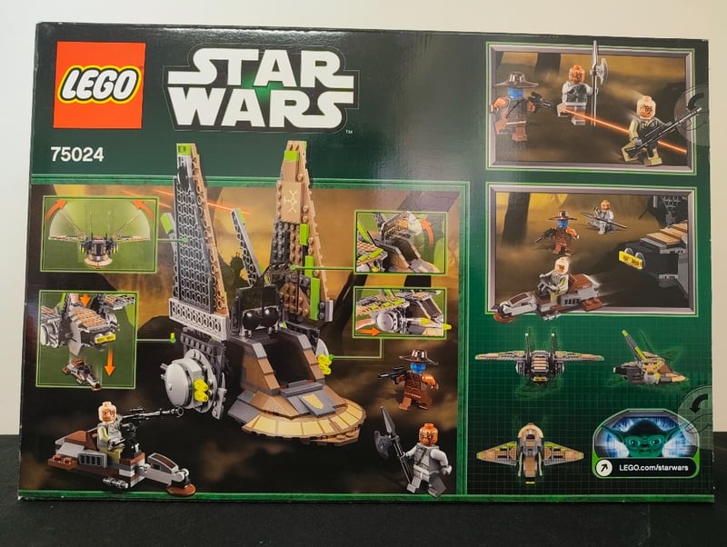 Lego Star Wars Set 75024 Featuring The Hh-87 Starhopper Spacecraft. This Buildable Starship Includes Detailed Construction With Tan And Grey Hull Plating, Lime-Green Accents On Wings, And A Functional Cockpit. The Set Comprises Four