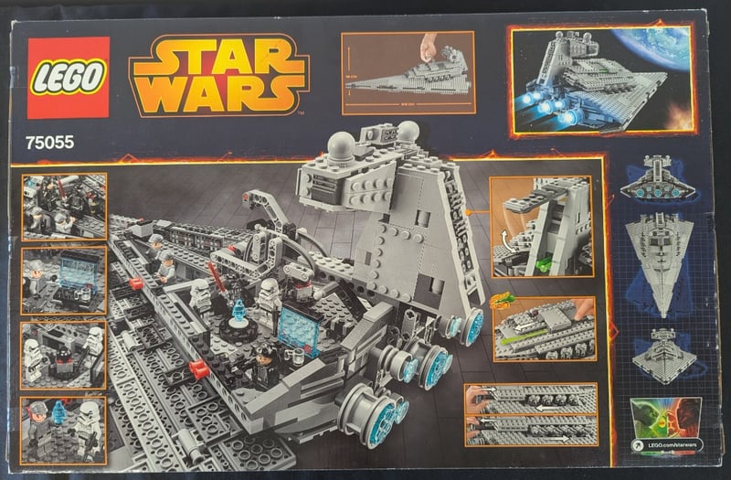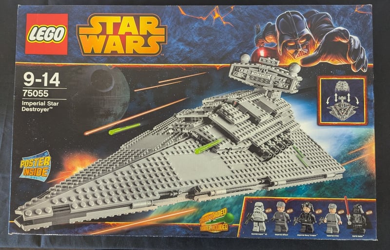 LEGO STAR WARS IMPERIAL STAR DESTROYER SET 75055Lego Star Wars Imperial Star Destroyer (75055) Featuring The Iconic Wedge-Shaped Capital Ship With Detailed Grey And Light Grey Brick Construction. Includes Motorized Base With Four Blue Wheels, Turret Elements With Spring-Loaded Shooters, Command Bridge Superstructure, And Hangar Bay Details. Five MinifiguresCondition: Good - Refer To Images584518+277