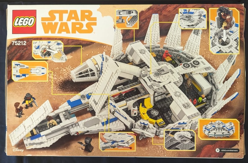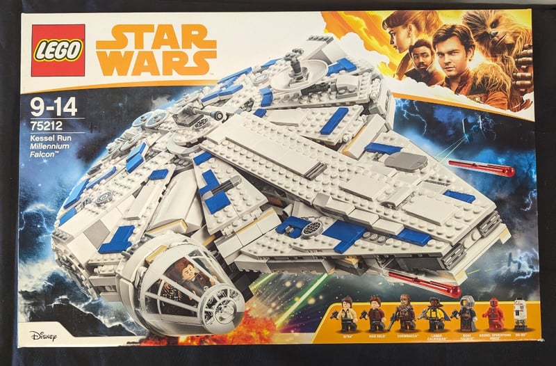 Lego Star Wars Set 75212 Featuring The Iconic Kessel Run Millennium Falcon. This Comprehensive Buildable Model Includes Seven Minifigures (Han Solo, Chewbacca, Lando Calrissian, Qi'Ra, Dryden Vos, Kessel Droid, And Bb-8). The Set Demonstrates Exceptional Engineering With Opening Cockpit Access, Detailed Interior Compartments, Movable Stabilizer Fins, And Rotating Turret Cannons. Recommended Age Range 9-14 Years. Authentic Disney Lego Production.