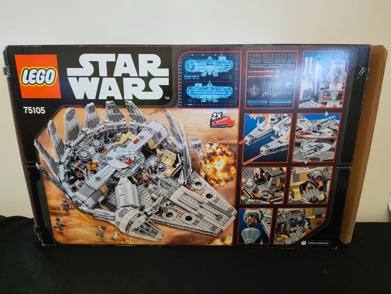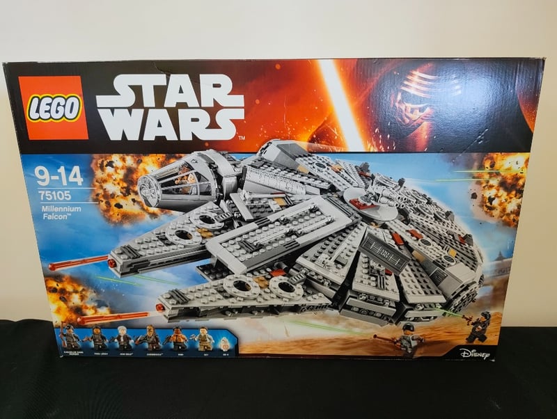 Vintage Lego Star Wars Millennium Falcon (Set 75105) Featuring 1,329 Pieces With Iconic Spacecraft Design, Seven Minifigures Including Han Solo And Chewbacca, Detailed Interior Cockpit And Cargo Hold Sections, Retractable Landing Gear, Rotating Turrets, And Original Retail Packaging With Cardboard Storage Box. Age-Appropriate For Ages 9-14. Condition Reflects Storage And Display Use With Minor Box Wear.