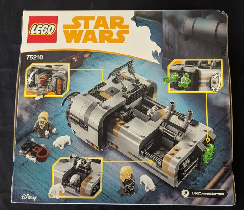 Lego Star Wars Set 75210 Featuring Moloch'S Landspeeder From The Solo Film Universe. This Buildable Vehicle Features White And Tan/Gold Coloring With Detailed Construction Including Opening Cockpit, Spring-Loaded Cannon Functions With Green Stud Projectiles, And Articulated Elements. Includes Four