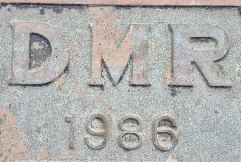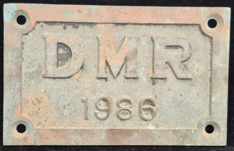 Cast Metal Industrial Nameplate Bearing "Dmr 1986" Designation. Rectangular Form With Four Corner Mounting Holes. Features Raised Lettering On Weathered Surface Showing Patina Consistent With Age And Outdoor Exposure. Reverse Side Shows Corrosion And Deterioration Typical Of Vintage Industrial Artifacts. Original Finish Heavily Oxidized With Rust Bloom And Surface Loss.