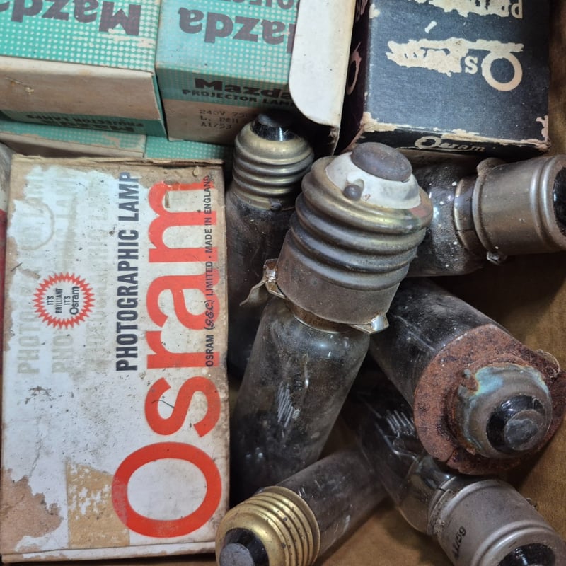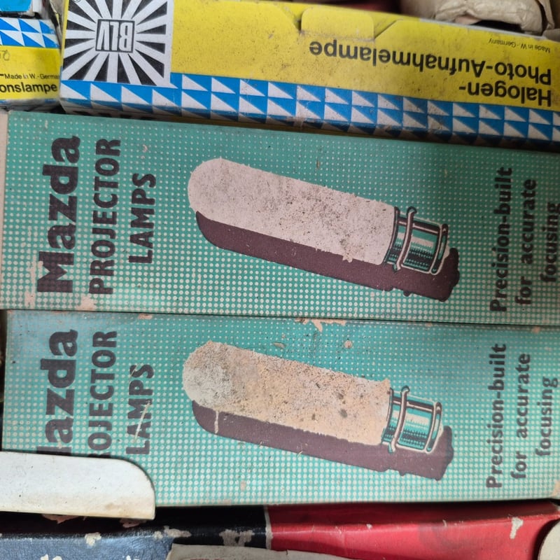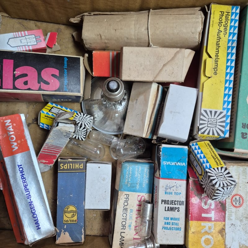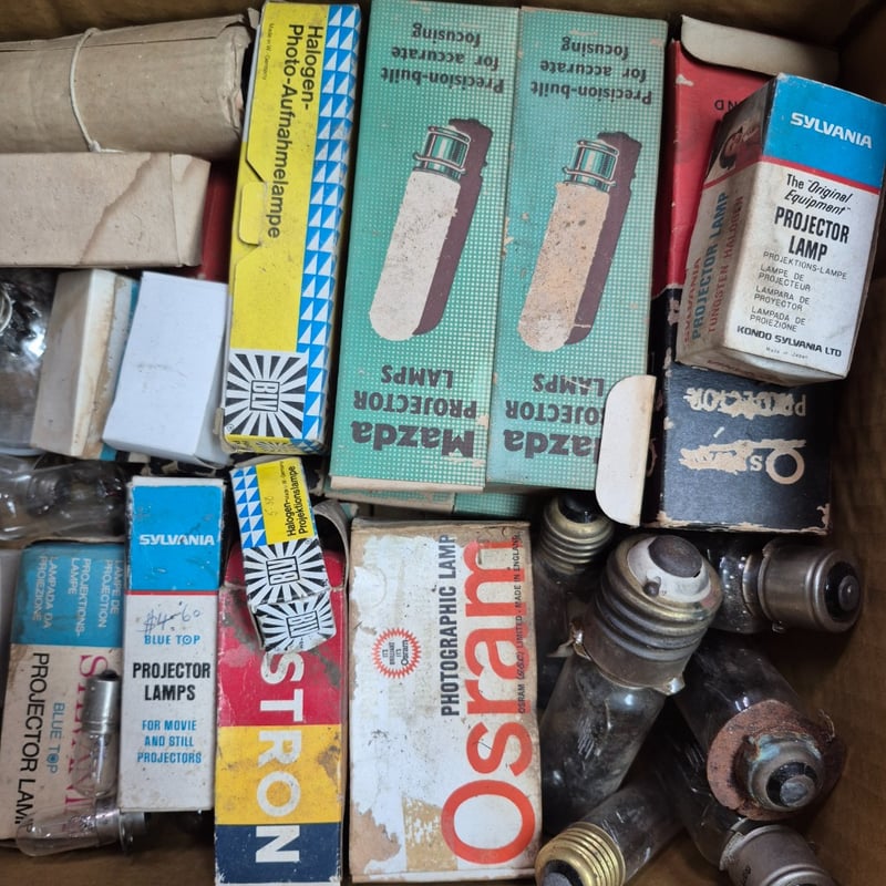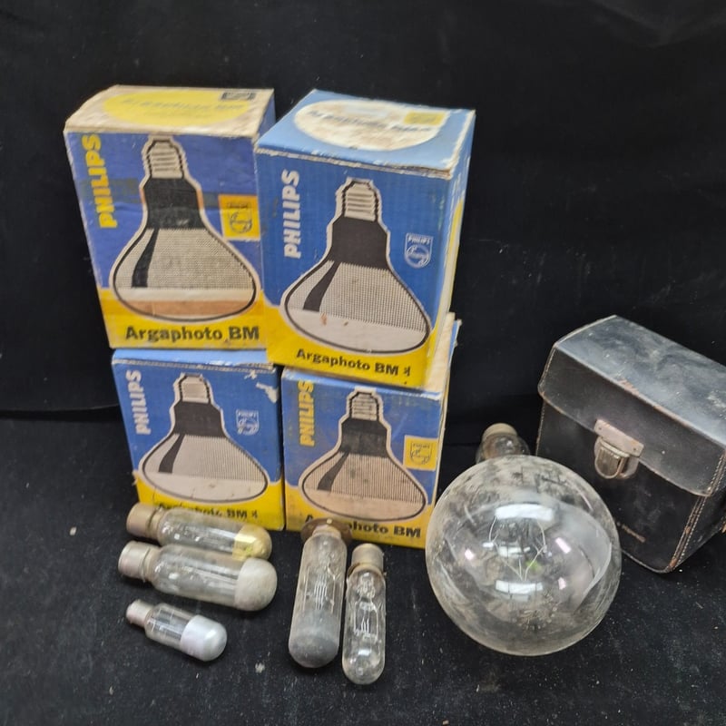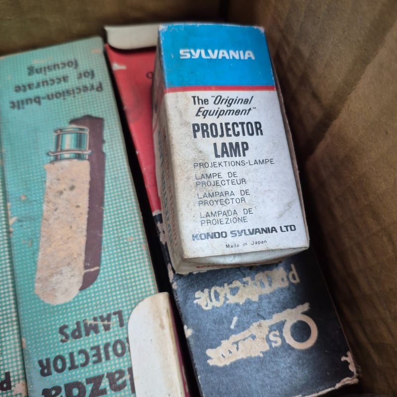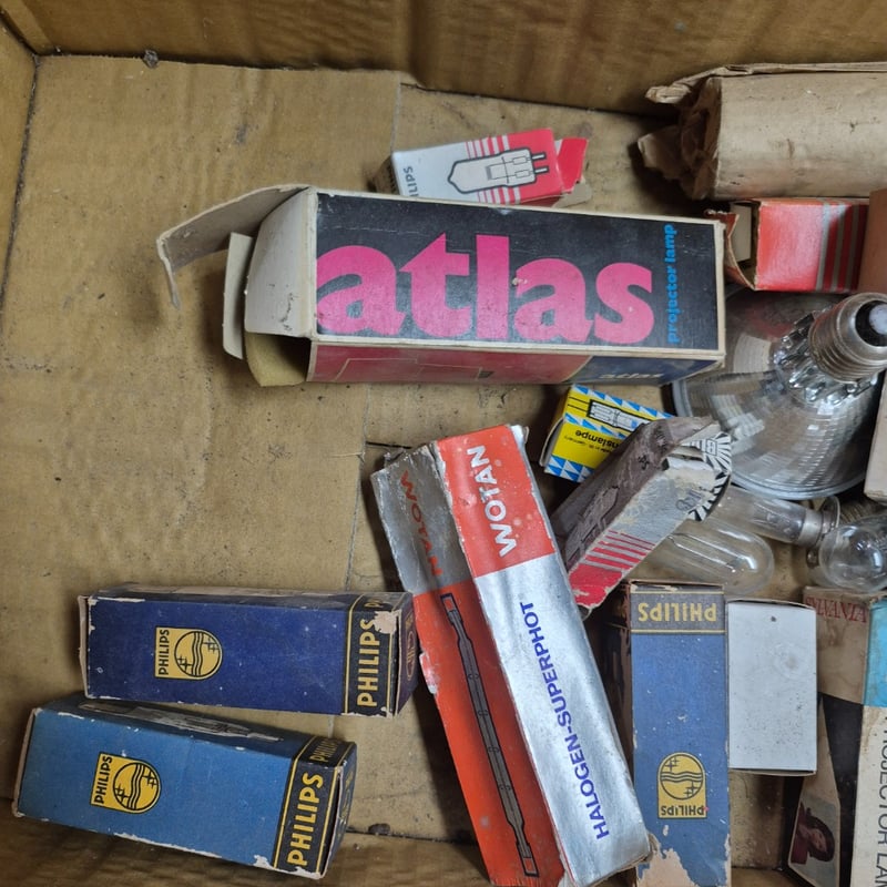 BOX OF OLD BULBS FOR PROJECTORS, CAMERAS AND MORE Comprehensive Collection Of Vintage Projector Lamps And Related Equipment Spanning Mid-20Th Century Manufacturers. Includes Boxed Philips Argaphoto Bm Lamps, Sylvania Projector Lamps, Mazda Projector Lamps, Atlas Lamps, And Osram Sylvania Branded Units. Features Original Packaging In Various Conditions. Untested Condition: Good - Refer To Images 587928+50