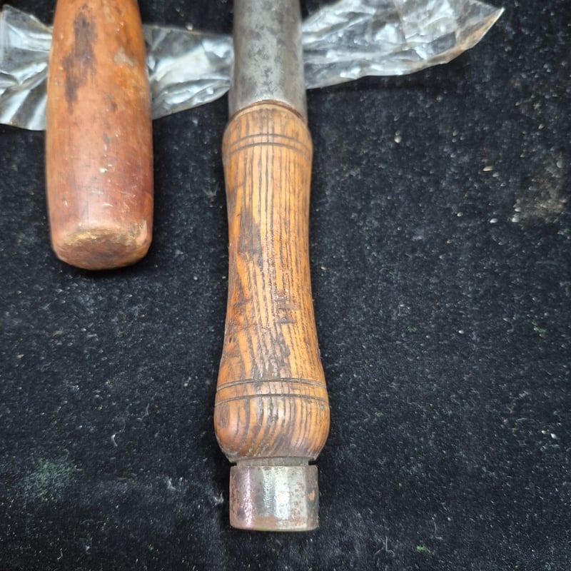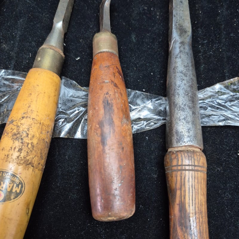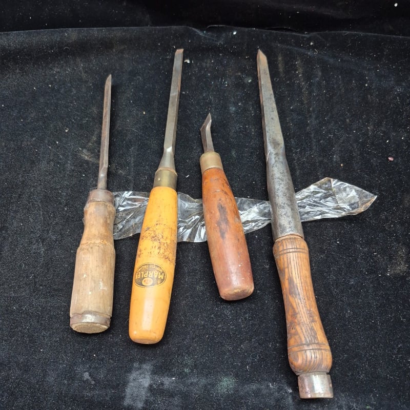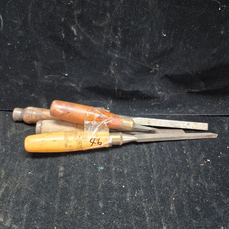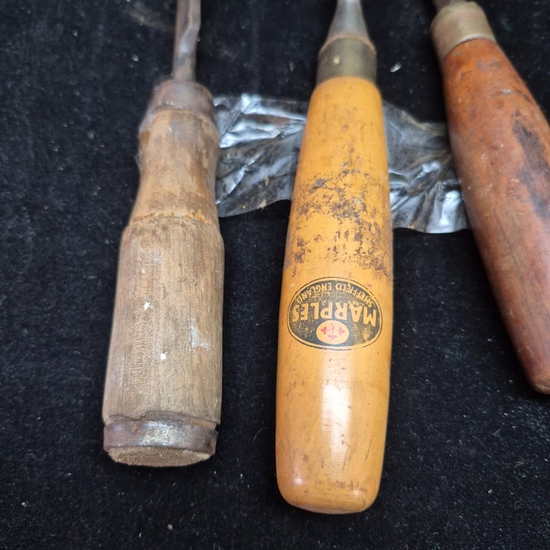 CHISELS Vintage Wood Chisels Featuring Turned Wooden Handles In Natural And Honey Tones. Includes Branded Examples Such As Marples (Visible Maker'S Mark). Chisels Display Varying Blade Widths Ranging From Narrow Gouges To Broader Flat Chisels. Condition: Fair - Refer To Images 587928+52