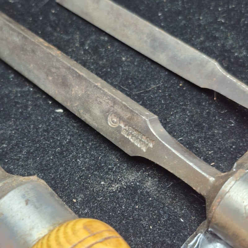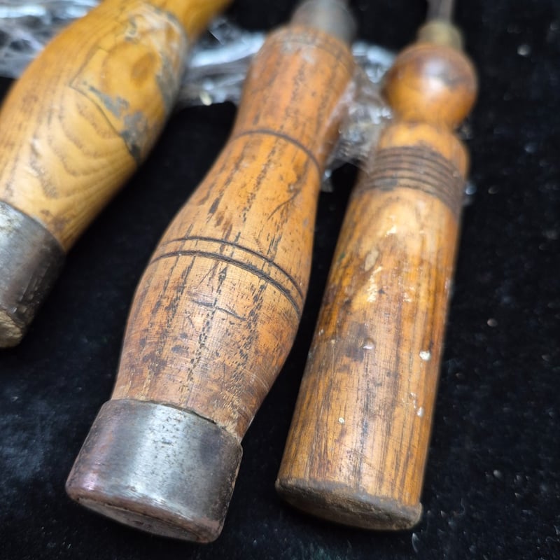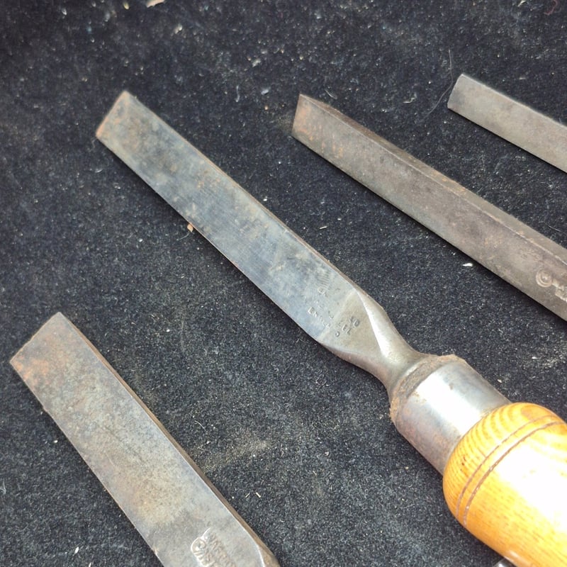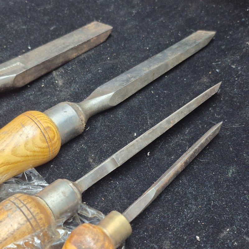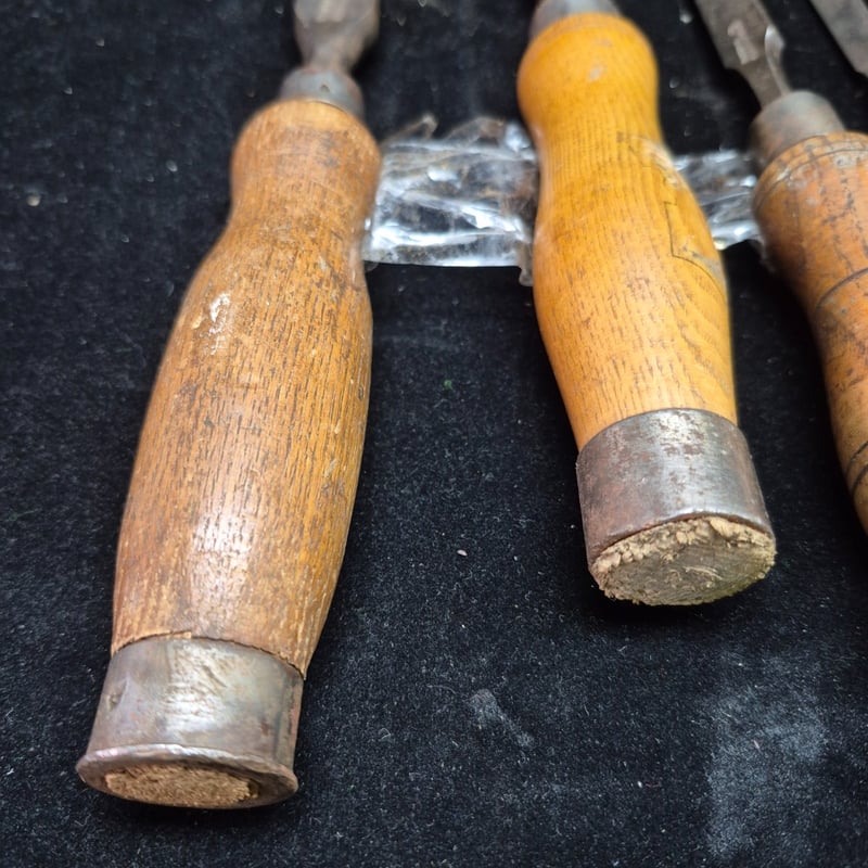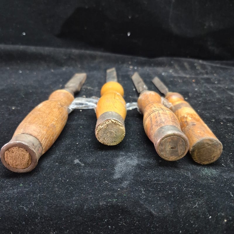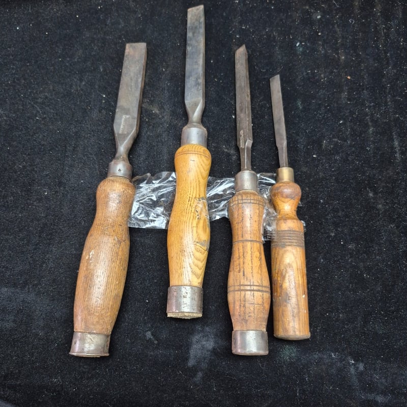 CHISELS A Collection Of Four Vintage Wood Carving Chisels Featuring Wooden Handles With Metal Ferrules And Steel Blades. The Set Includes Flat Chisels Of Varying Widths And One Rounded Gouge. Condition: Fair - Refer To Images 587928+54