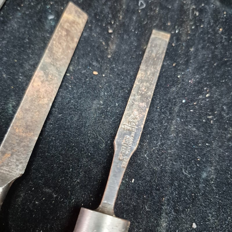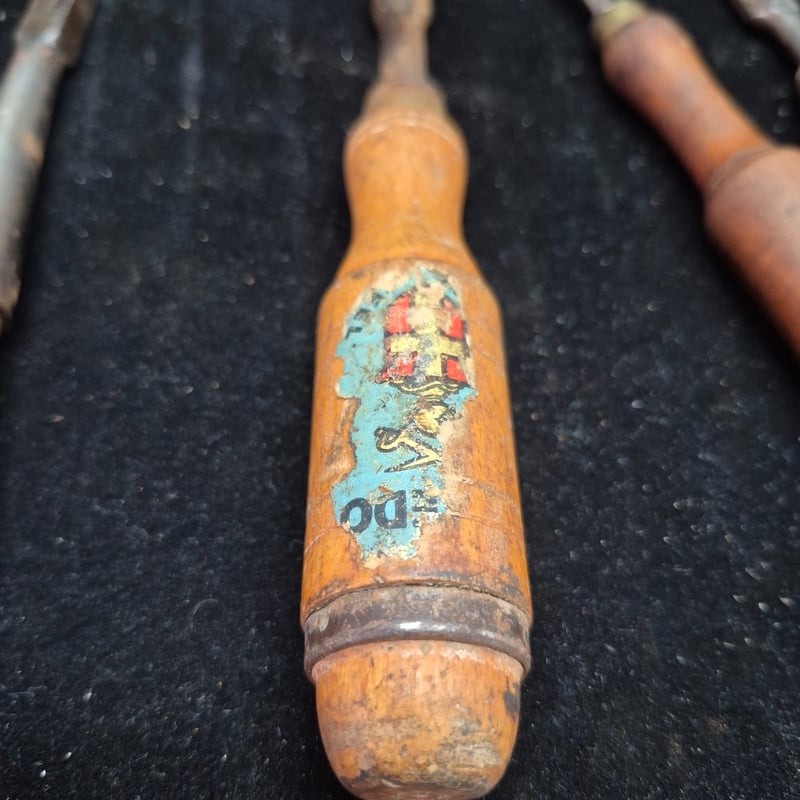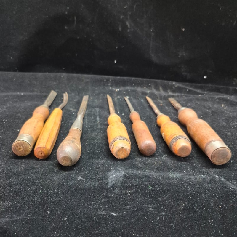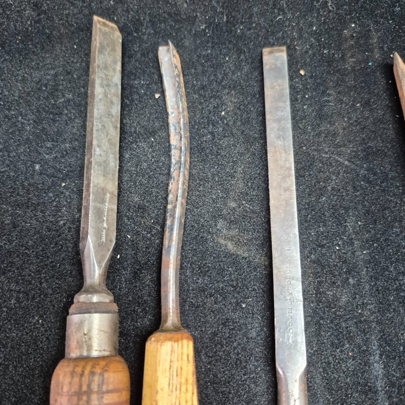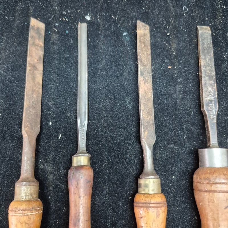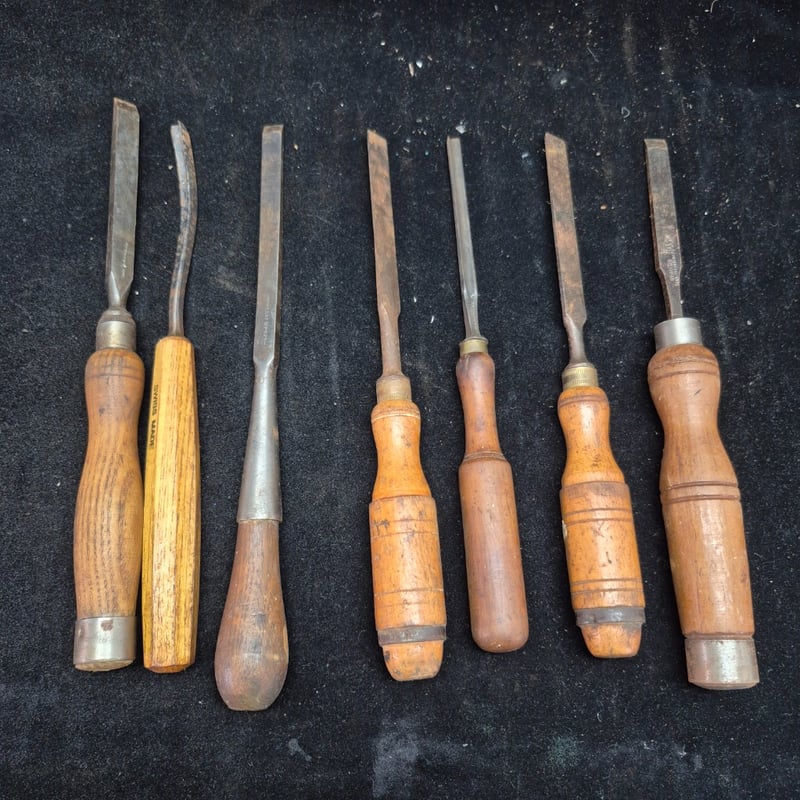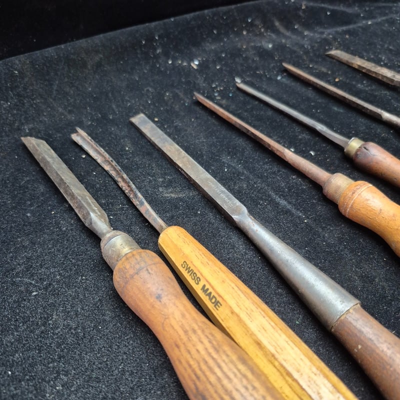 CHISELS A Substantial Collection Of Vintage Chisels Featuring Wooden Handles In Varying Tones Of Natural And Honey-Coloured Timber. The Set Includes A Swiss Made Example, Brass Ferrule-Fitted Chisels With Flat And Curved Blade Profiles. Condition: Fair - Refer To Images 587928+55