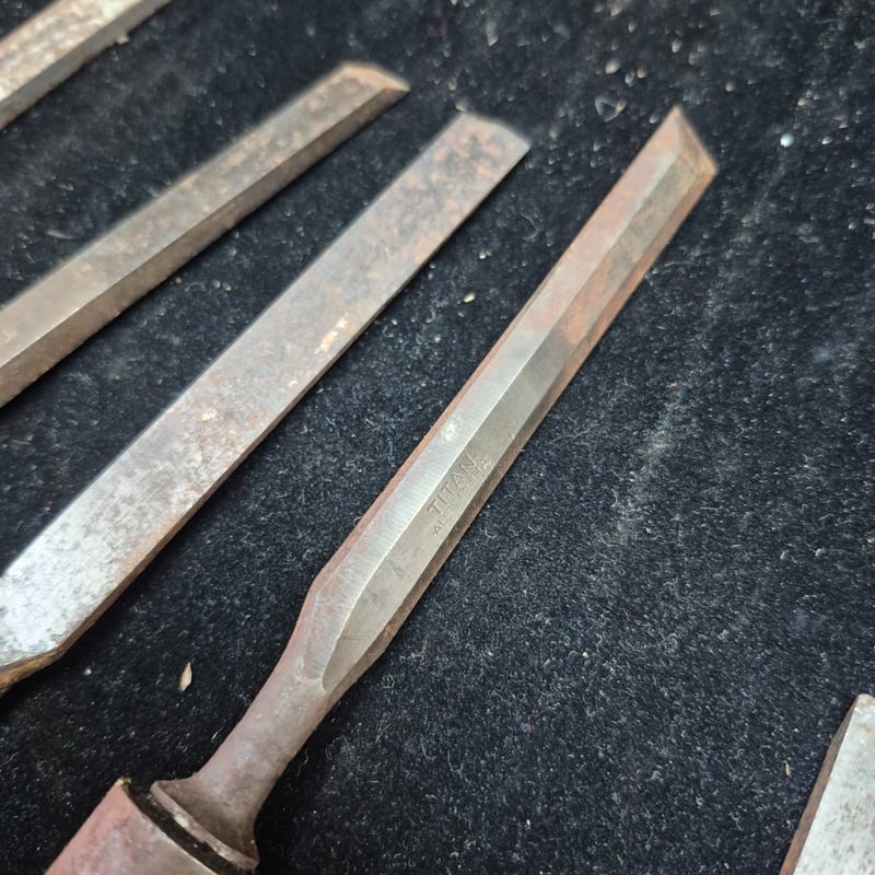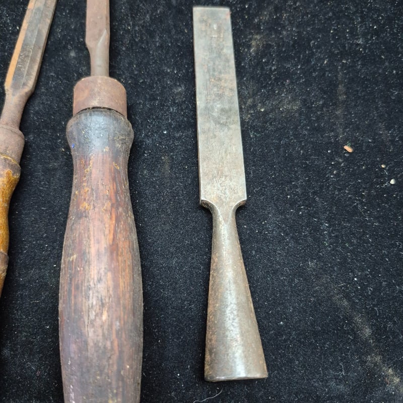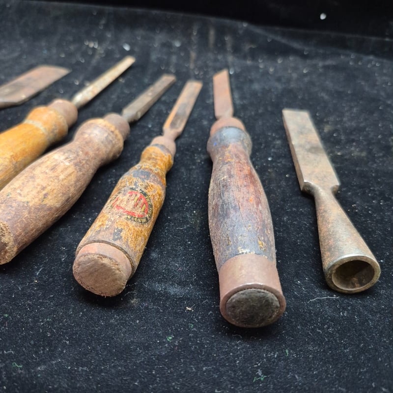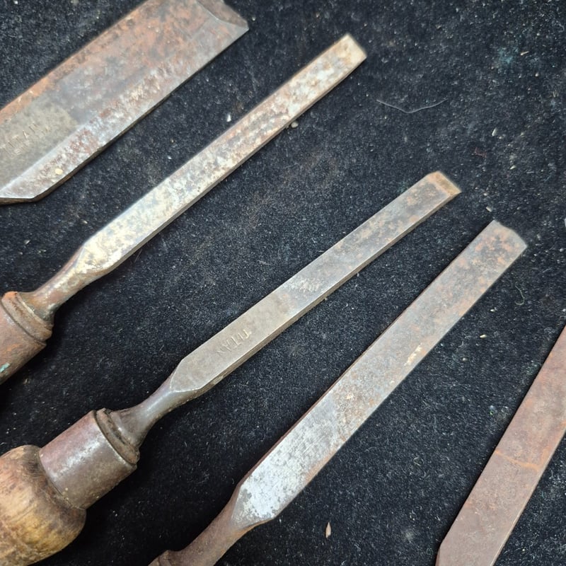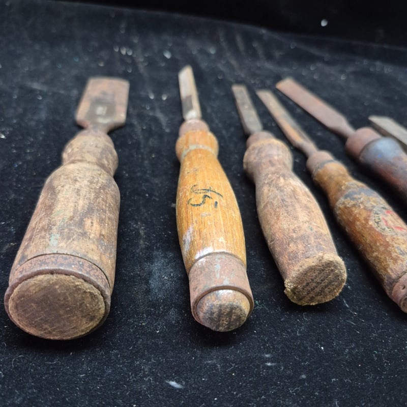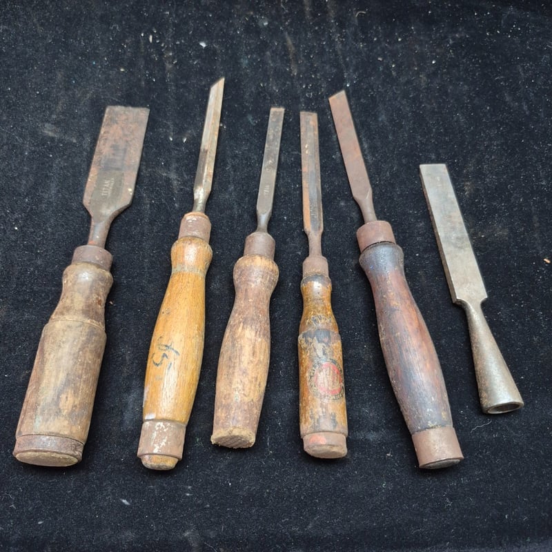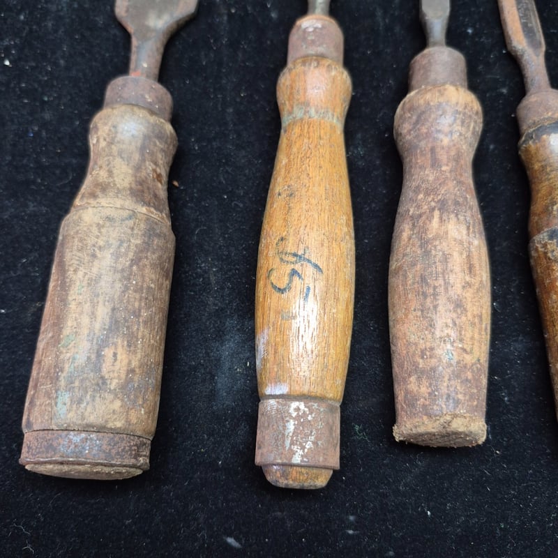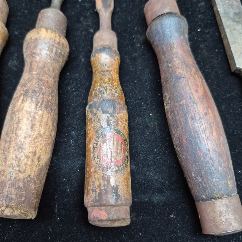 CHISELS A Collection Of Vintage Chisels And Woodworking Tools Featuring Wooden Handles With Metal Ferrules And Steel Blades. The Set Includes Flat Chisels Of Varying Widths, With One Specimen Bearing Maker'S Marks And Stamped Branding. Condition: Fair - Refer To Images 587928+56