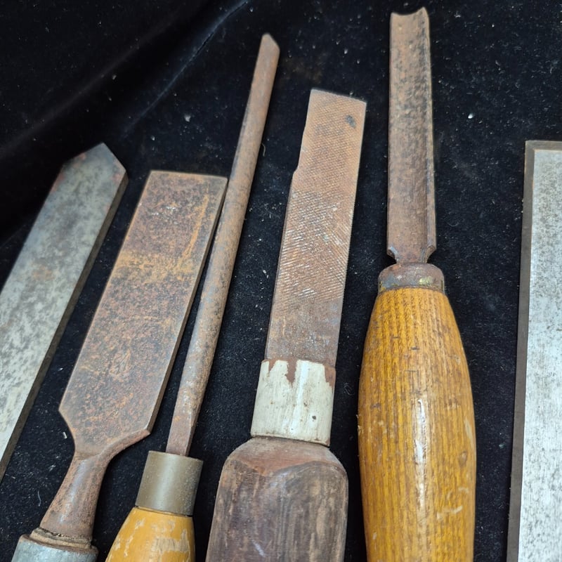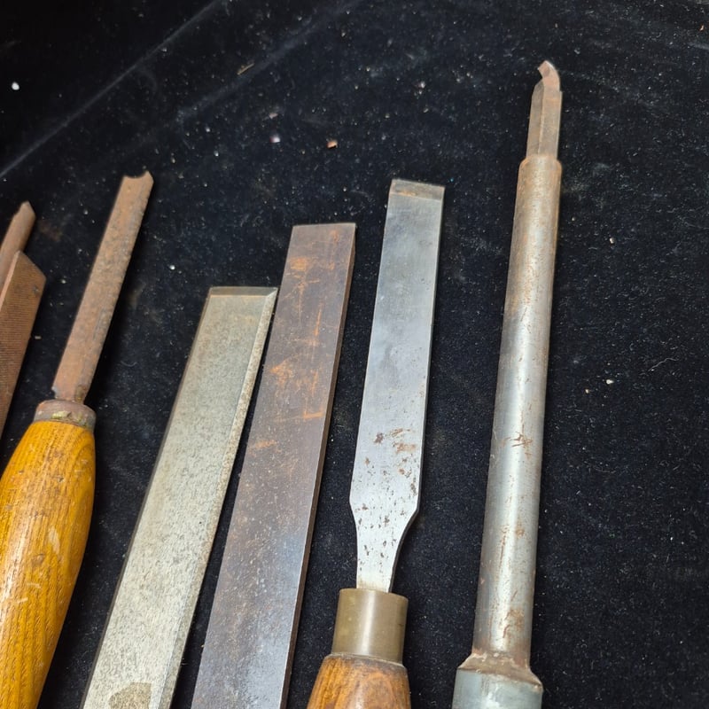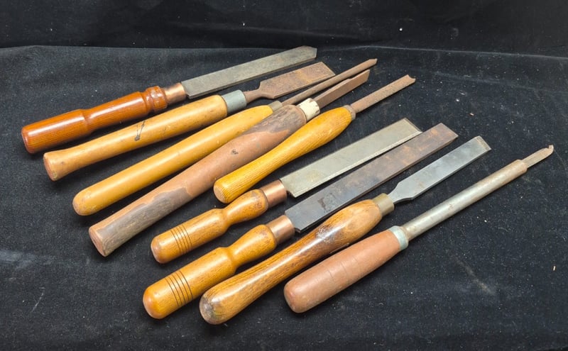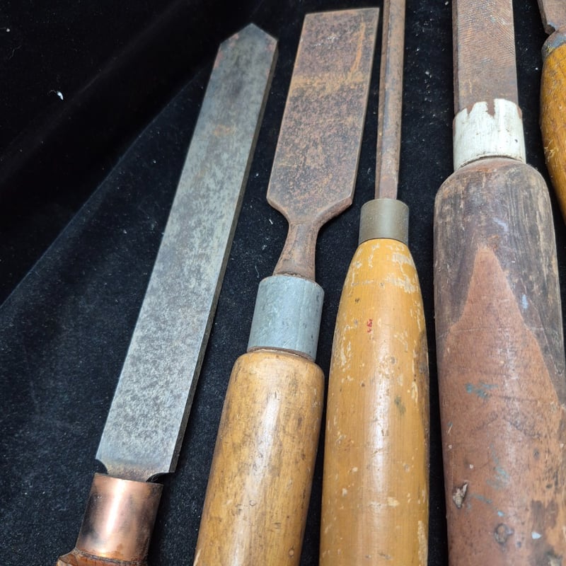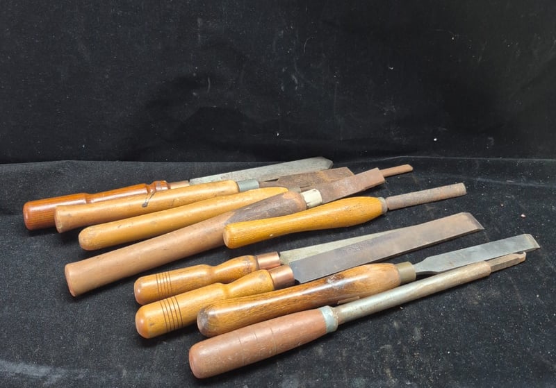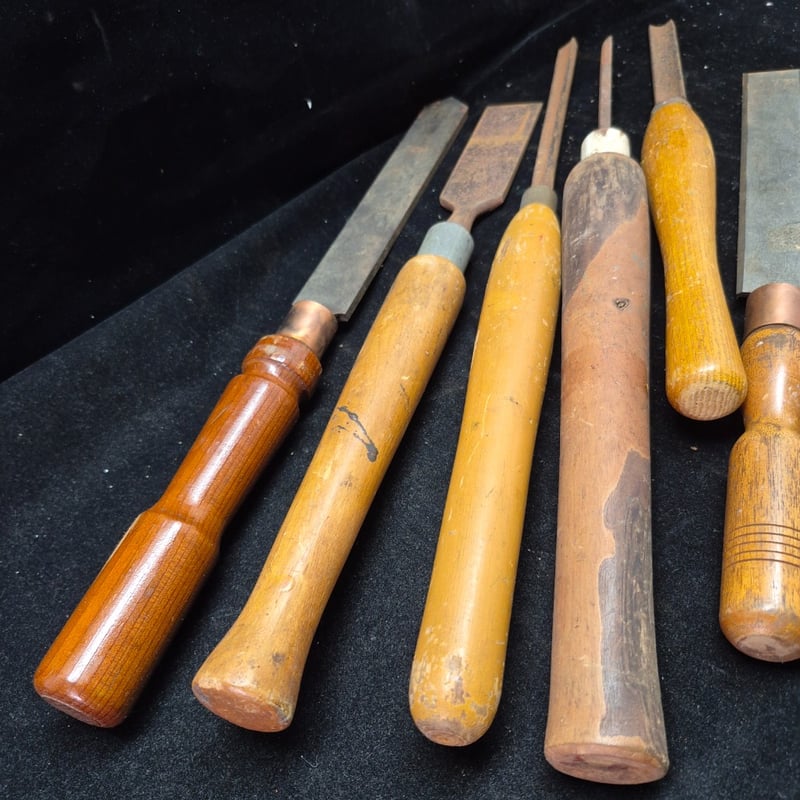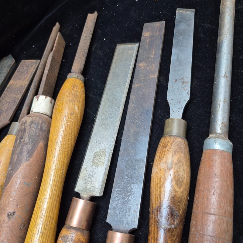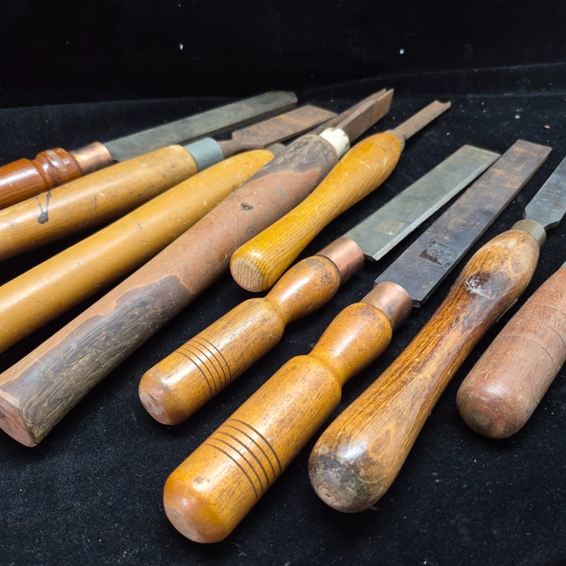 LATHE CHIZELS Comprehensive Collection Of Traditional Woodworking Chisels Featuring Wooden Handles With Copper Ferrules. Set Includes Chisels Of Varying Widths, Ranging From Narrow Detail Chisels To Wide Bench Chisels. Blades Display Characteristic Patina With Some Oxidation Consistent With Age. Condition: Fair - Refer To Images 587928+57