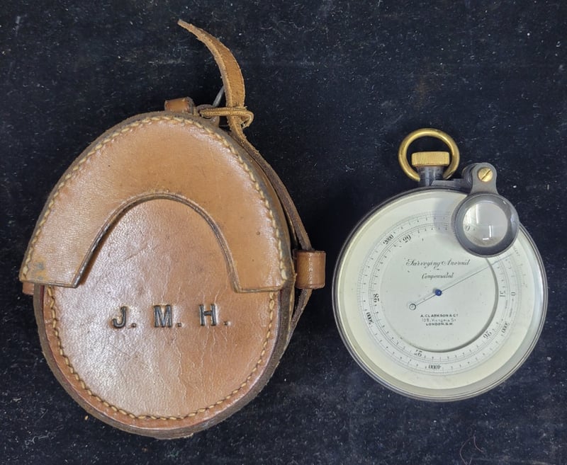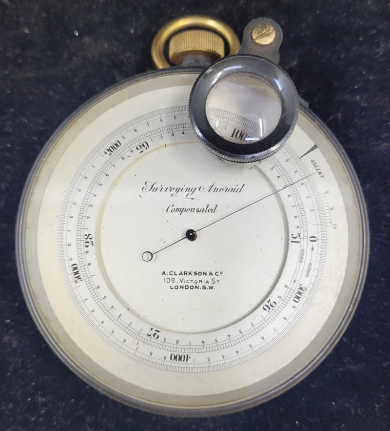 OLD SURVEYERS ANEOID - CLARKSONS, LONDON BRAND A Fine Victorian Surveying Aneroid Barometer By A. Clarkson & Co Of London, Featuring Compensated Mechanism For Temperature Variation. The Case Features Red Baize Lining And Leather Strap Closure. Back Plate Engraved With Brass Maker'S Marks. Condition: Good - Refer To Images 587928+85