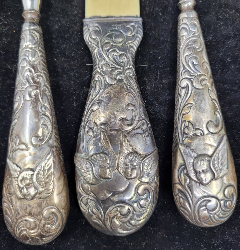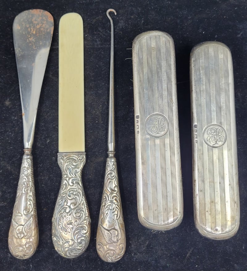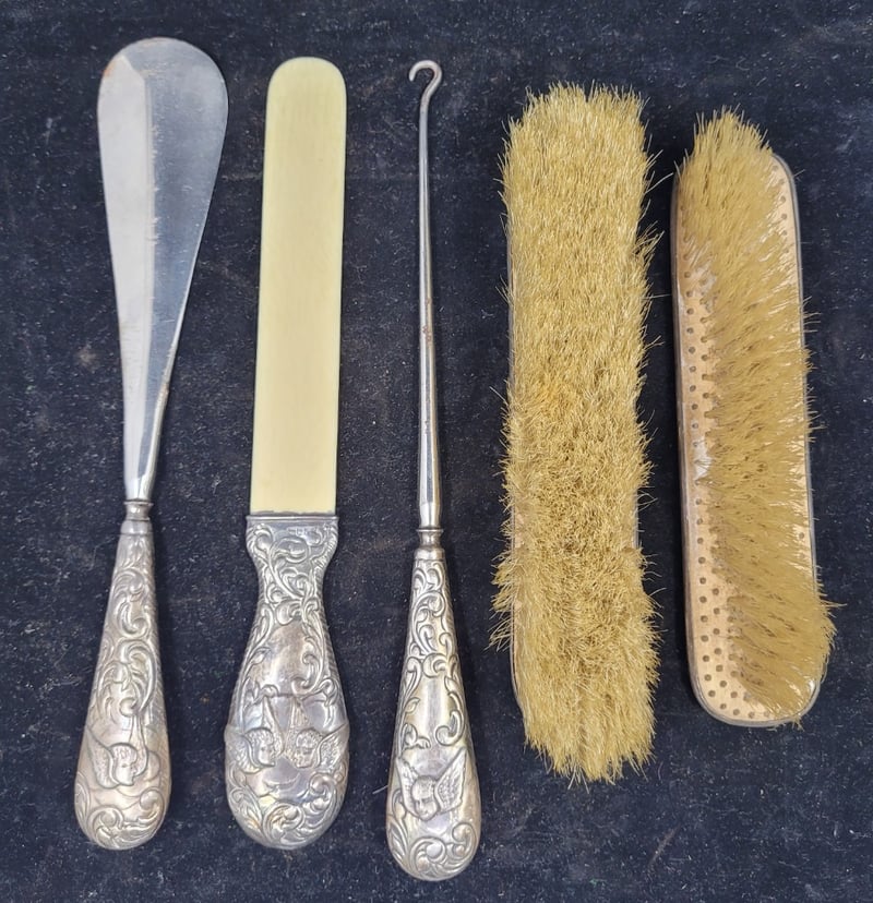 BOX CONTAINING SILVER BRUSHES, BOOT HOOK AND SHOE HORN Condition: Good - Refer To Images 587928+86