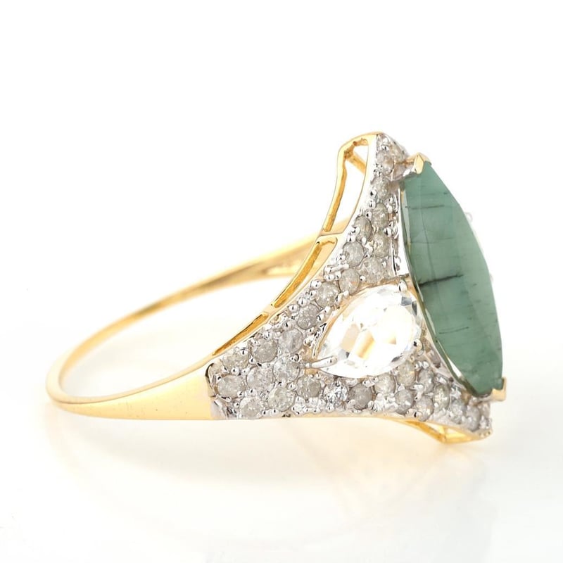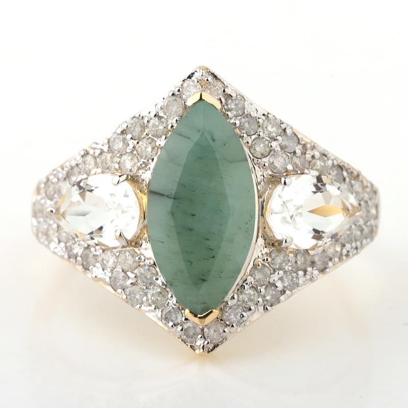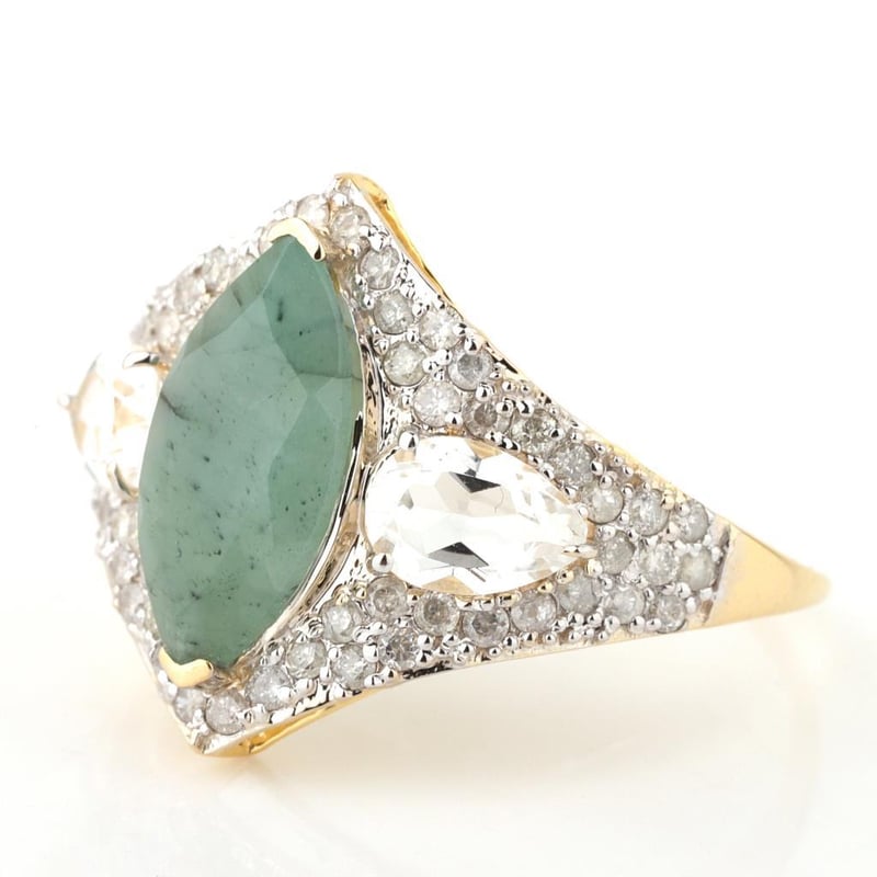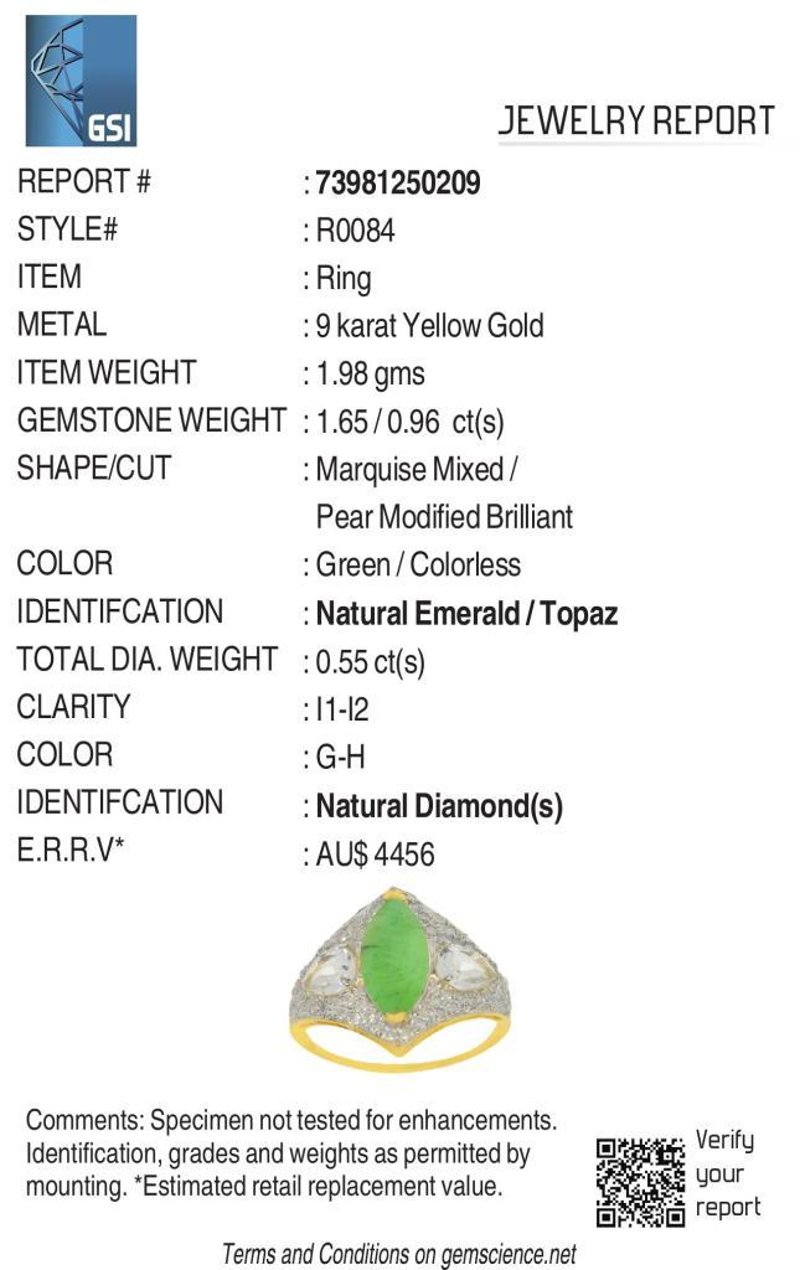 9CT YELLOW GOLD NATURAL EMERALD / NATURAL WHITE TOPAZ & DIAMOND RING WITH VALUATION Weight Of The Item: 1.98 GFineness Of Metal(S): Yellow Gold 9KtThe Ring Consists Of (1) Marquise Brilliant Natural Emerald & (2) Pear Brilliant Cut White Topaz. Surrounding The Main Stones Are Round Brilliant Cut Natural Diamonds.Antique StyleIdentification: Natural Emerald / Natural White TopazColor: Green / WhiteShape: Marquise Brilliant Cut / Pear Faceted CutNo. Of Stone: 3Dimension: 12 Mm X 6 Mm X 7.2 MmWeight: 1.65 Carats / 0.96 CaratsCut: Very GoodIdentification: Natural DiamondShape: Round Brilliant CutWeight: 0.55 CtsCut: ExcellentCondition: Brand New (Unsold Jewellery Store Stock) Refer To Gemmologist Report For Further Grading Notes Accompanied By Gemmologist Report Issued By Gemological Science International (Gsi).Replacement Retail Value:$4456 Markings: 9ct Condition: Good - Refer Images 0488580+14