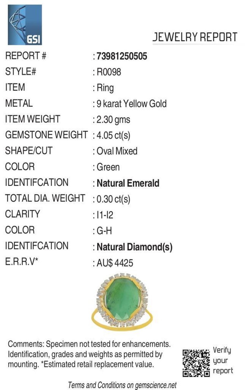 9CT YELLOW GOLD NATURAL EMERALD & DIAMOND RING WITH VALUATION Weight Of The Item: 2.3 GFineness Of Metal(S): Yellow Gold 9KtThe Ring Consists Of (1) Oval Brilliant Natural Emerald. Surrounding The Main Stones Are Round Brilliant Cut Natural Diamonds.Antique StyleIdentification: Natural EmeraldColor: GreenShape: Oval Brilliant CutNo. Of Stone: 1Dimension: 14 Mm X 10 Mm X 8.4 MmWeight: 4.05 CaratsCut: Very GoodIdentification: Natural DiamondShape: Round Brilliant CutWeight: 0.3 CtsCut: ExcellentCondition: Brand New (Unsold Jewellery Store Stock) Refer To Gemmologist Report For Further Grading Notes Accompanied By Gemmologist Report Issued By Gemological Science International (Gsi).Replacement Retail Value:$4425 Markings: 9ct Condition: Good - Refer Images 0488580+49