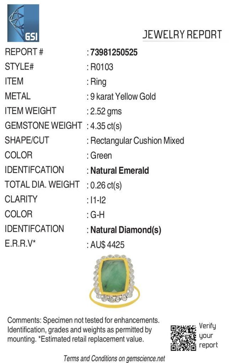 9CT YELLOW GOLD NATURAL EMERALD & DIAMOND RING WITH VALUATION Weight Of The Item: 2.52 GFineness Of Metal(S): Yellow Gold 9KtThe Ring Consists Of (1) Cushion Brilliant Natural Emerald. Surrounding The Main Stones Are Round Brilliant Cut Natural Diamonds.Antique StyleIdentification: Natural EmeraldColor: GreenShape: Cushion Brilliant CutNo. Of Stone: 1Dimension: 14 Mm X 9 Mm X 8.4 MmWeight: 4.35 CaratsCut: Very GoodIdentification: Natural DiamondShape: Round Brilliant CutWeight: 0.26 CtsCut: ExcellentCondition: Brand New (Unsold Jewellery Store Stock) Refer To Gemmologist Report For Further Grading Notes Accompanied By Gemmologist Report Issued By Gemological Science International (Gsi).Replacement Retail Value:$4425 Markings: 9ct Condition: Good - Refer Images 0488580+61