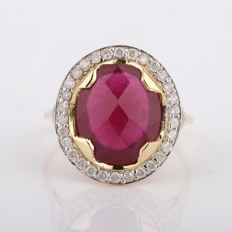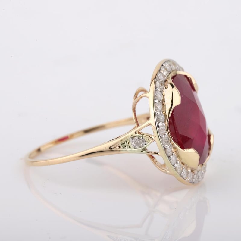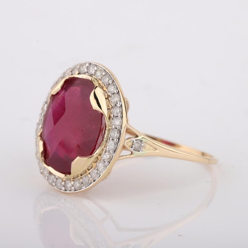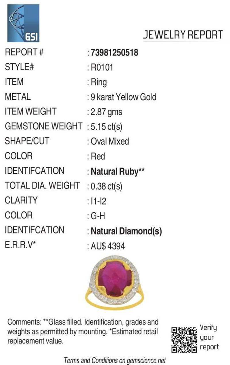 9CT YELLOW GOLD NATURAL RUBY & DIAMOND RING WITH VALUATION Weight Of The Item: 2.87 GFineness Of Metal(S): Yellow Gold 9KtThe Ring Consists Of (1) Oval Brilliant Natural Ruby. Surrounding The Main Stones Are Round Brilliant Cut Natural Diamonds.Antique StyleIdentification: Natural RubyColor: RedShape: Oval Brilliant CutNo. Of Stone: 1Dimension: 12 Mm X 10 Mm X 7.2 MmWeight: 5.15 CaratsCut: Very GoodIdentification: Natural DiamondShape: Round Brilliant CutWeight: 0.38 CtsCut: ExcellentCondition: Brand New (Unsold Jewellery Store Stock) Refer To Gemmologist Report For Further Grading Notes Accompanied By Gemmologist Report Issued By Gemological Science International (Gsi).Replacement Retail Value:$4394 Markings: 9ct Condition: Good - Refer Images 0488580+58
