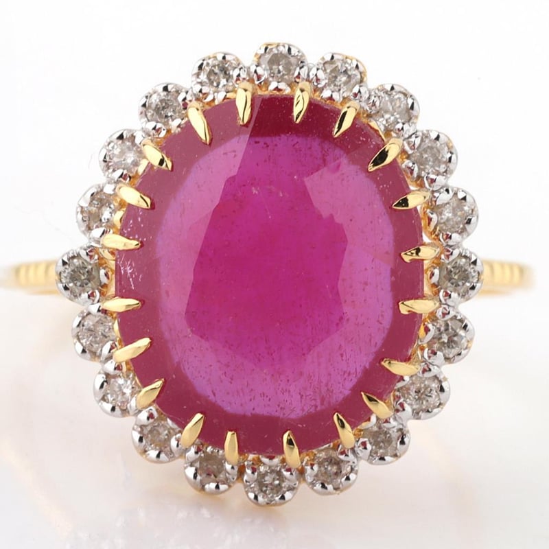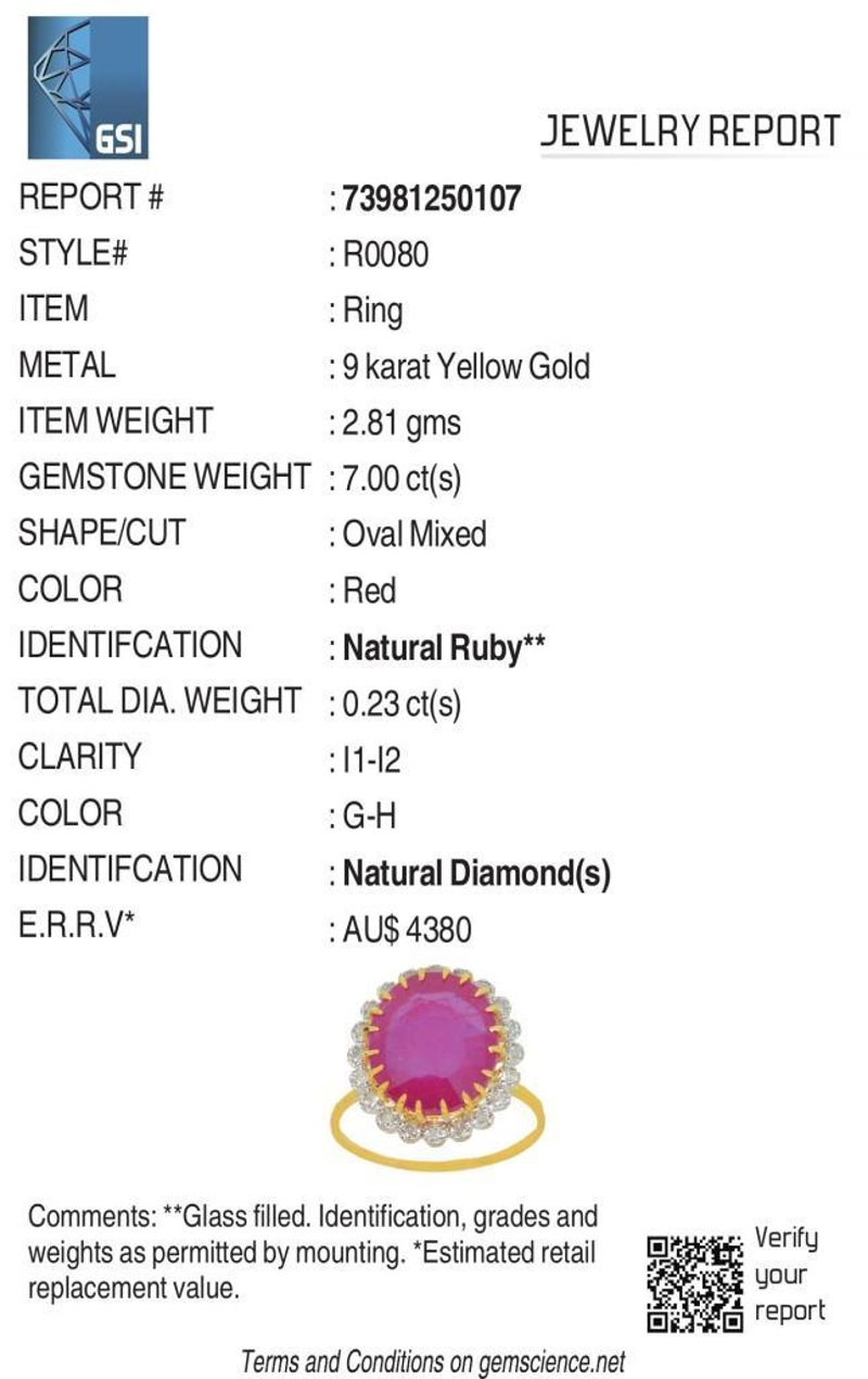 9CT YELLOW GOLD NATURAL RUBY & DIAMOND RING WITH VALUATION Weight Of The Item: 2.81 GFineness Of Metal(S): Yellow Gold 9KtThe Ring Consists Of (1) Oval Brilliant Natural Ruby. Surrounding The Main Stones Are Round Brilliant Cut Natural Diamonds.Antique StyleIdentification: Natural RubyColor: RedShape: Oval Brilliant CutNo. Of Stone: 1Dimension: 12 Mm X 10 Mm X 7.2 MmWeight: 7 CaratsCut: Very GoodIdentification: Natural DiamondShape: Round Brilliant CutWeight: 0.23 CtsCut: ExcellentCondition: Brand New (Unsold Jewellery Store Stock) Refer To Gemmologist Report For Further Grading Notes Accompanied By Gemmologist Report Issued By Gemological Science International (Gsi).Replacement Retail Value:$4380 Markings: 9ct Condition: Good - Refer Images 0488580+3