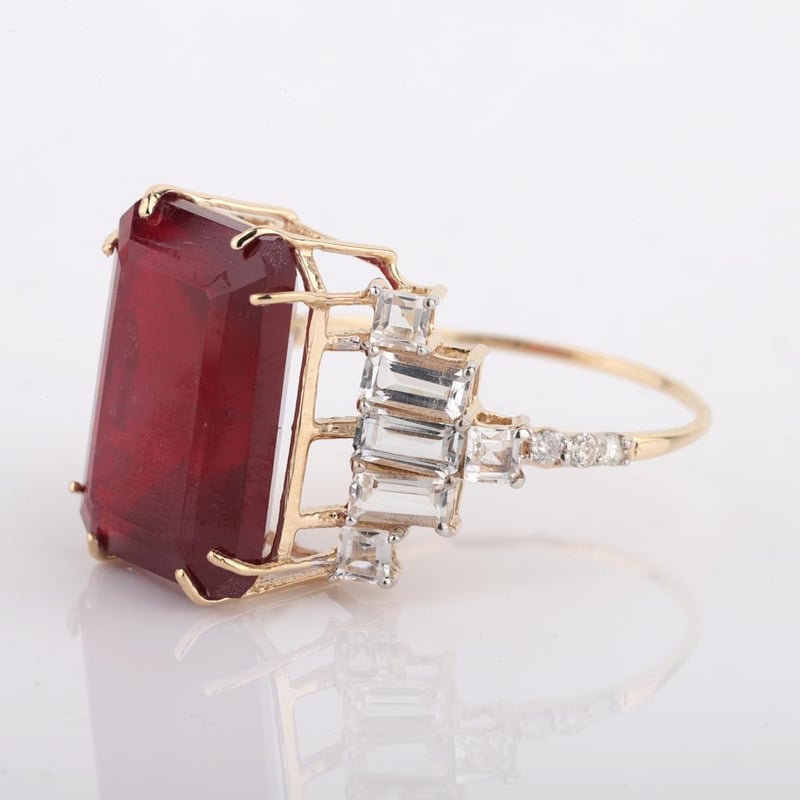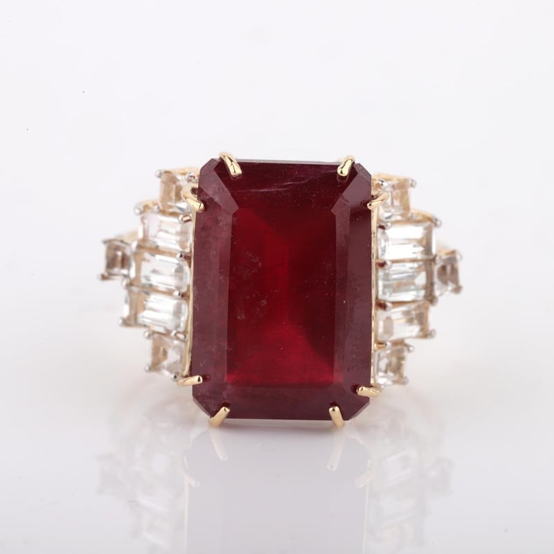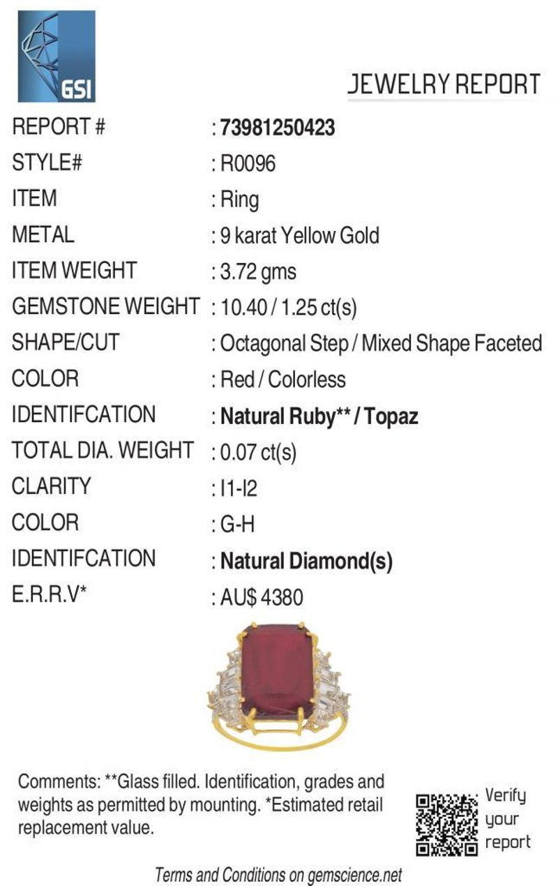 9CT YELLOW GOLD NATURAL RUBY / NATURAL WHITE TOPAZ & DIAMOND RING WITH VALUATION Weight Of The Item: 3.72 GFineness Of Metal(S): Yellow Gold 9KtThe Ring Consists Of (1) Octagon Step Natural Ruby & (12) Octagon+Square Brilliant Cut White Topaz. Surrounding The Main Stones Are Round Brilliant Cut Natural Diamonds.Antique StyleIdentification: Natural Ruby / Natural White TopazColor: Red / WhiteShape: Octagon Step Cut / Octagon+Square Faceted CutNo. Of Stone: 13Dimension: 14 Mm X 10 Mm X 8.4 MmWeight: 10.4 Carats / 1.25 CaratsCut: Very GoodIdentification: Natural DiamondShape: Round Brilliant CutWeight: 0.07 CtsCut: ExcellentCondition: Brand New (Unsold Jewellery Store Stock) Refer To Gemmologist Report For Further Grading Notes Accompanied By Gemmologist Report Issued By Gemological Science International (Gsi).Replacement Retail Value:$4380 Markings: 9ct Condition: Good - Refer Images 0488580+45