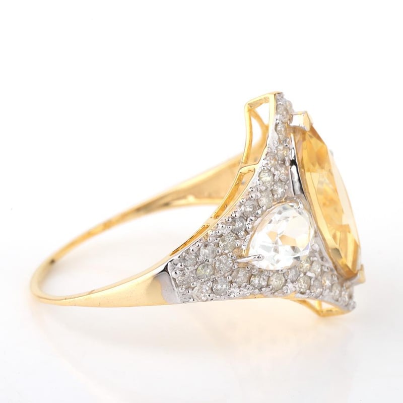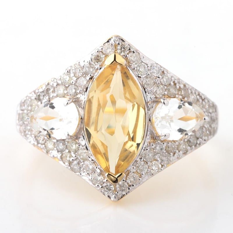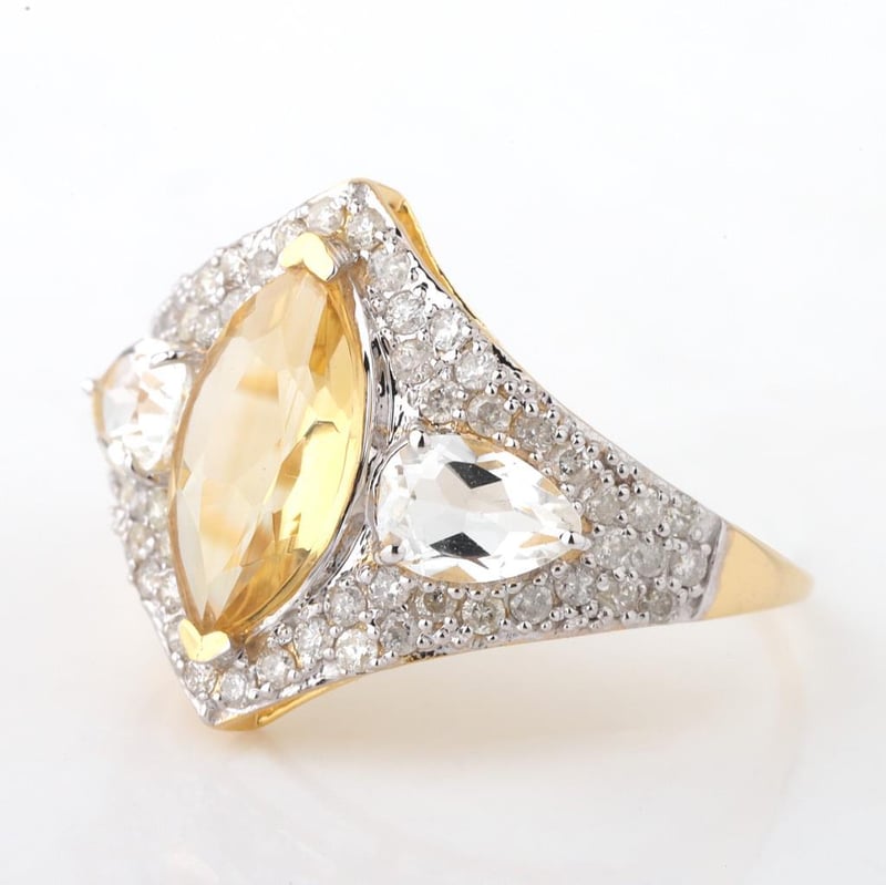 9CT YELLOW GOLD NATURAL CITRINE / NATURAL WHITE TOPAZ & DIAMOND RING WITH VALUATION Weight Of The Item: 2.04 GFineness Of Metal(S): Yellow Gold 9KtThe Ring Consists Of (1) Marquise Brilliant Natural Citrine & (2) Pear Brilliant Cut White Topaz. Surrounding The Main Stones Are Round Brilliant Cut Natural Diamonds.Antique StyleIdentification: Natural Citrine / Natural White TopazColor: Yellow / WhiteShape: Marquise Brilliant Cut / Pear Faceted CutNo. Of Stone: 3Dimension: 12 Mm X 6 Mm X 7.2 MmWeight: 1.1 Carats / 0.96 CaratsCut: Very GoodIdentification: Natural DiamondShape: Round Brilliant CutWeight: 0.55 CtsCut: ExcellentCondition: Brand New (Unsold Jewellery Store Stock) Refer To Gemmologist Report For Further Grading Notes Accompanied By Gemmologist Report Issued By Gemological Science International (Gsi).Replacement Retail Value:$4365 Markings: 9ct Condition: Good - Refer Images 0488580+16