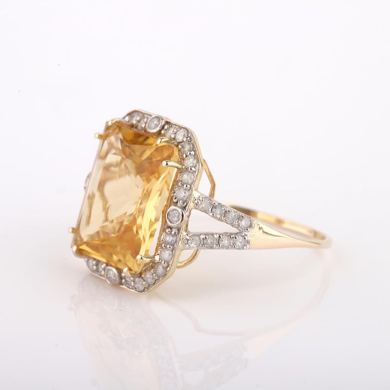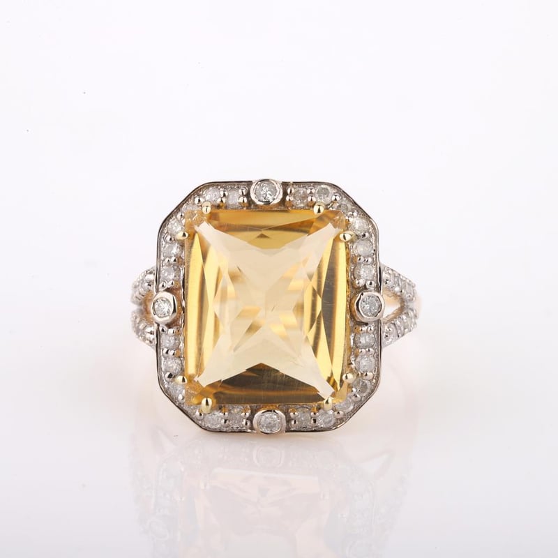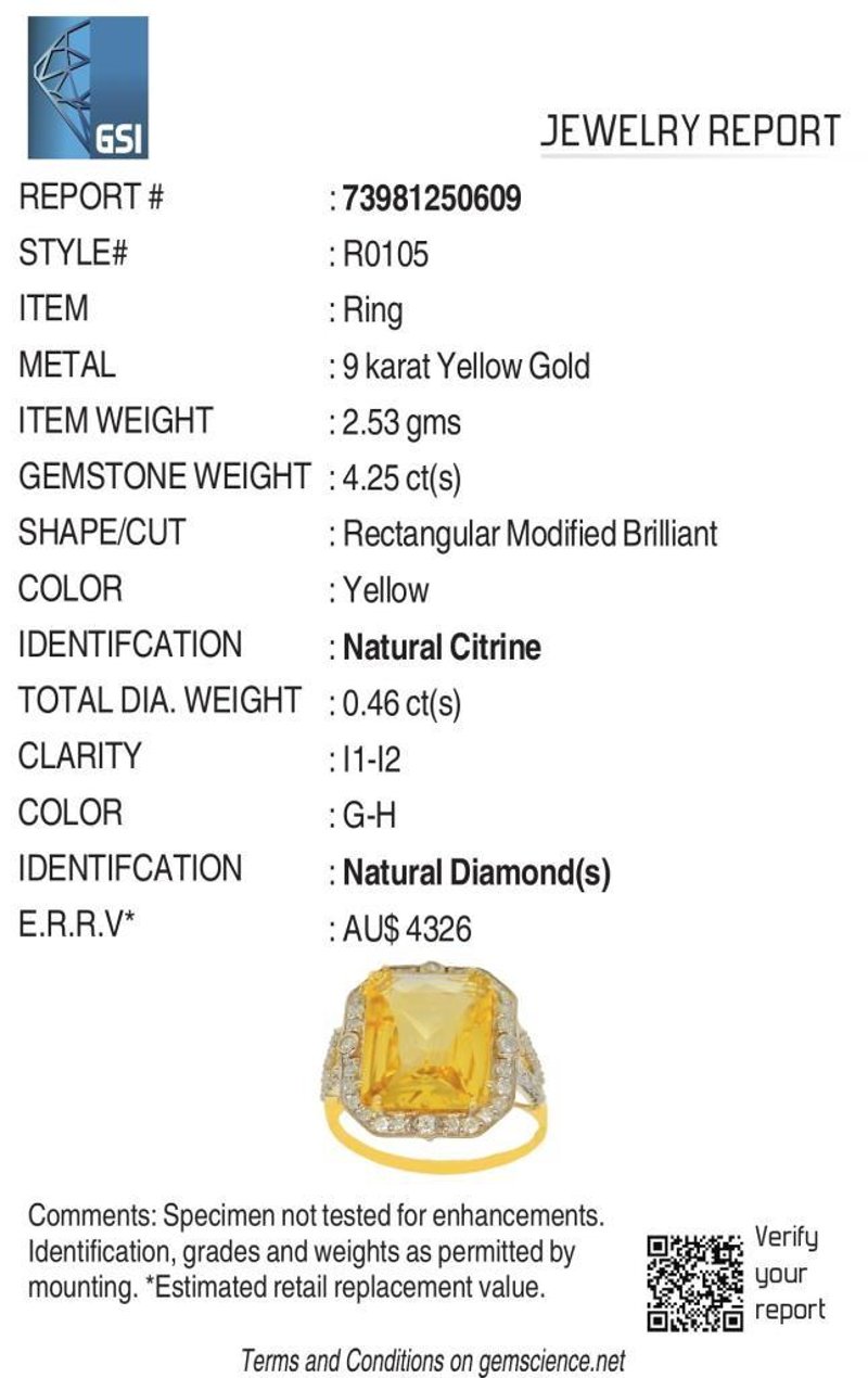 9CT YELLOW GOLD NATURAL CITRINE & DIAMOND RING WITH VALUATION Weight Of The Item: 2.53 GFineness Of Metal(S): Yellow Gold 9KtThe Ring Consists Of (1) Octagon Brilliant Natural Citrine. Surrounding The Main Stones Are Round Brilliant Cut Natural Diamonds.Antique StyleIdentification: Natural CitrineColor: YellowShape: Octagon Brilliant CutNo. Of Stone: 1Dimension: 12 Mm X 10 Mm X 7.2 MmWeight: 4.25 CaratsCut: Very GoodIdentification: Natural DiamondShape: Round Brilliant CutWeight: 0.46 CtsCut: ExcellentCondition: Brand New (Unsold Jewellery Store Stock) Refer To Gemmologist Report For Further Grading Notes Accompanied By Gemmologist Report Issued By Gemological Science International (Gsi).Replacement Retail Value:$4326 Markings: 9ct Condition: Good - Refer Images 0488580+63