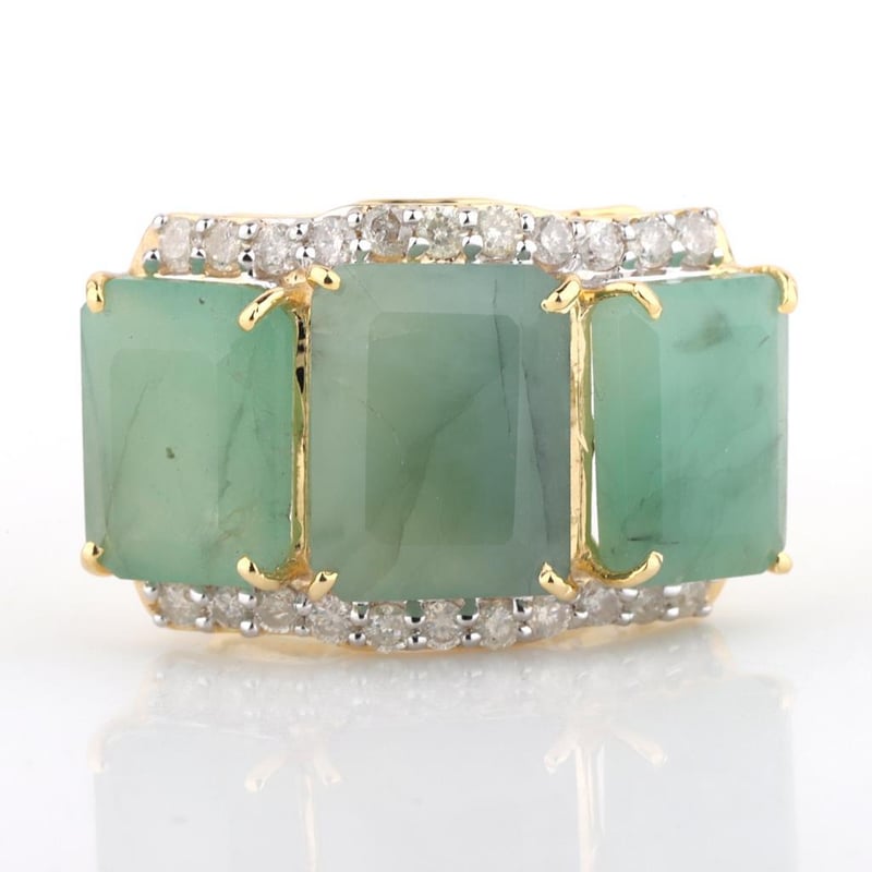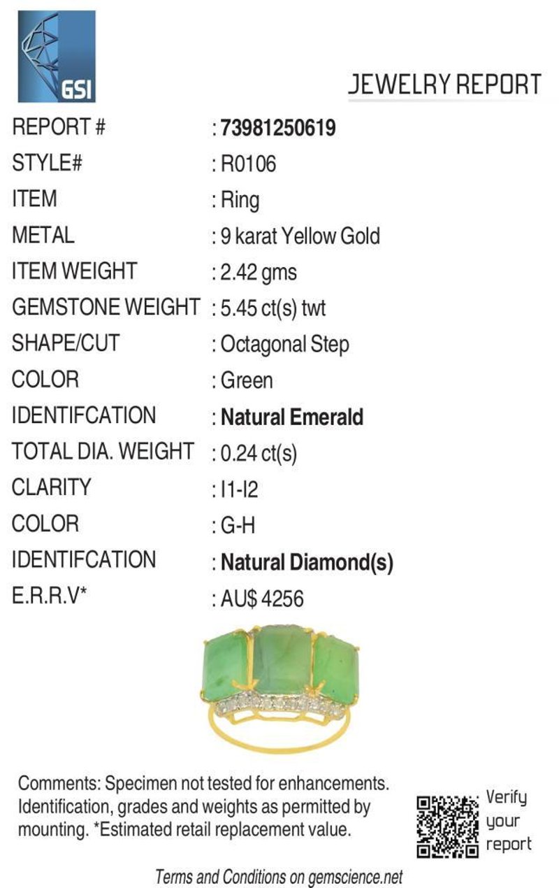 9CT YELLOW GOLD NATURAL EMERALD / NATURAL & DIAMOND RING WITH VALUATION Weight Of The Item: 2.42 GFineness Of Metal(S): Yellow Gold 9KtThe Ring Consists Of (1) Octagon Brilliant Natural Emerald & (2) Octagon Brilliant Cut . Surrounding The Main Stones Are Round Brilliant Cut Natural Diamonds.Antique StyleIdentification: Natural Emerald / Natural Color: Green / GreenShape: Octagon Brilliant Cut / Octagon Faceted CutNo. Of Stone: 3Dimension: 9 Mm X 7 Mm X 5.4 MmWeight: 5.45 CaratsCut: Very GoodIdentification: Natural DiamondShape: Round Brilliant CutWeight: 0.24 CtsCut: ExcellentCondition: Brand New (Unsold Jewellery Store Stock) Refer To Gemmologist Report For Further Grading Notes Accompanied By Gemmologist Report Issued By Gemological Science International (Gsi).Replacement Retail Value:$4256 Markings: 9ct Condition: Good - Refer Images 0488580+65