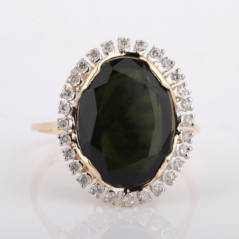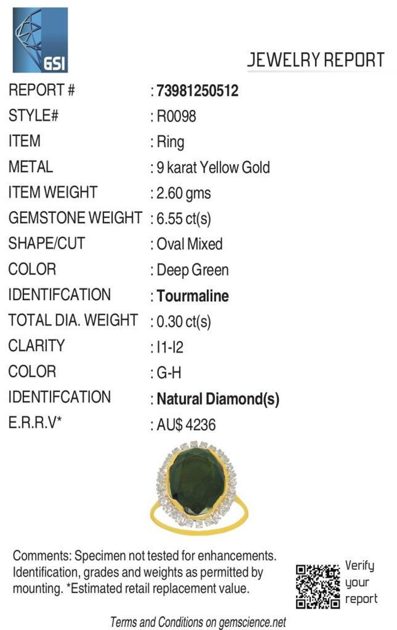 9CT YELLOW GOLD NATURAL TOURMALINE & DIAMOND RING WITH VALUATION Weight Of The Item: 2.6 GFineness Of Metal(S): Yellow Gold 9KtThe Ring Consists Of (1) Oval Brilliant Natural Tourmaline. Surrounding The Main Stones Are Round Brilliant Cut Natural Diamonds.Antique StyleIdentification: Natural TourmalineColor: GreenShape: Oval Brilliant CutNo. Of Stone: 1Dimension: 14 Mm X 10 Mm X 8.4 MmWeight: 6.55 CaratsCut: Very GoodIdentification: Natural DiamondShape: Round Brilliant CutWeight: 0.3 CtsCut: ExcellentCondition: Brand New (Unsold Jewellery Store Stock) Refer To Gemmologist Report For Further Grading Notes Accompanied By Gemmologist Report Issued By Gemological Science International (Gsi).Replacement Retail Value:$4236 Markings: 9ct Condition: Good - Refer Images 0488580+54