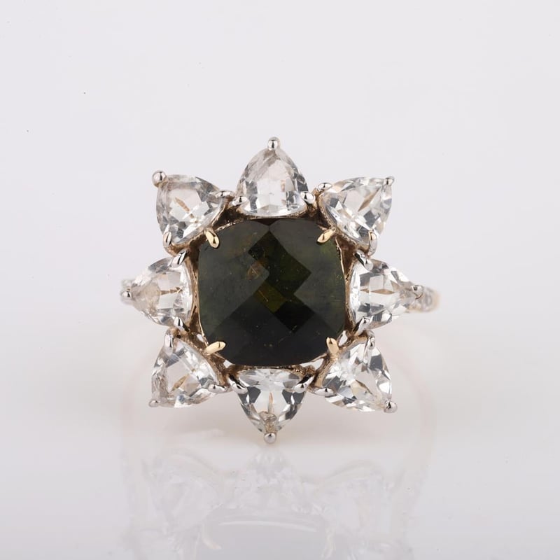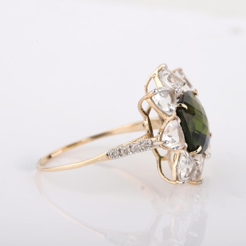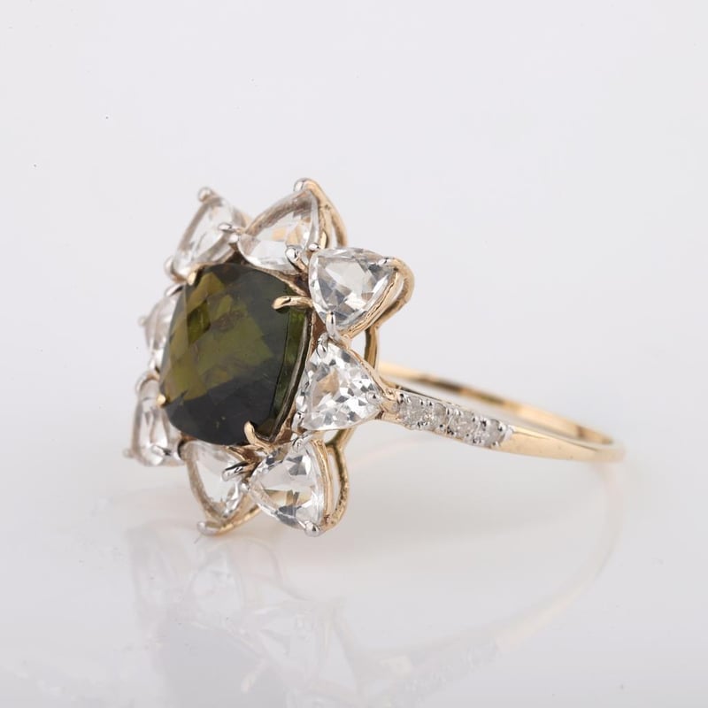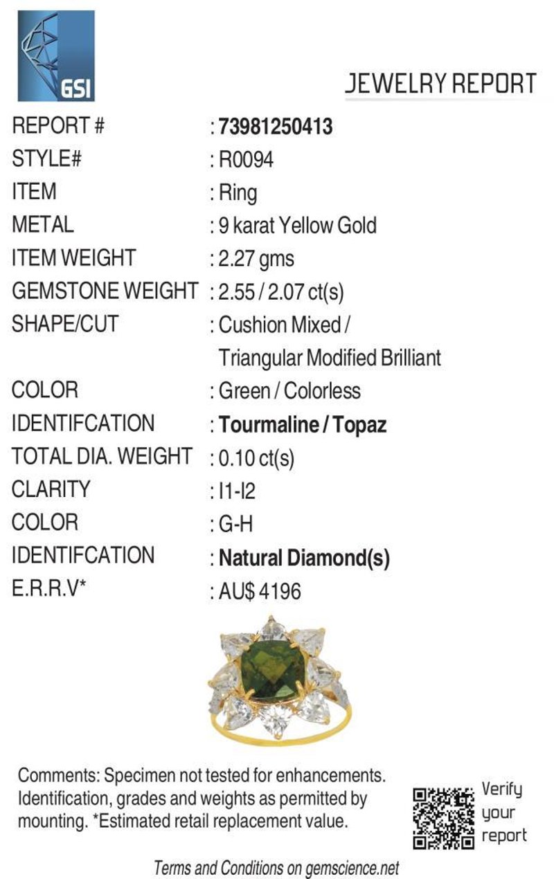9CT YELLOW GOLD NATURAL TOURMALINE / NATURAL WHITE TOPAZ & DIAMOND RING WITH VALUATION Weight Of The Item: 2.27 GFineness Of Metal(S): Yellow Gold 9KtThe Ring Consists Of (1) Cushion Brilliant Natural Tourmaline & (8) Trillion Brilliant Cut White Topaz. Surrounding The Main Stones Are Round Brilliant Cut Natural Diamonds.Antique StyleIdentification: Natural Tourmaline / Natural White TopazColor: Green / WhiteShape: Cushion Brilliant Cut / Trillion Faceted CutNo. Of Stone: 9Dimension: 8 Mm X 8 Mm X 4.8 MmWeight: 2.55 Carats / 2.07 CaratsCut: Very GoodIdentification: Natural DiamondShape: Round Brilliant CutWeight: 0.1 CtsCut: ExcellentCondition: Brand New (Unsold Jewellery Store Stock) Refer To Gemmologist Report For Further Grading Notes Accompanied By Gemmologist Report Issued By Gemological Science International (Gsi).Replacement Retail Value:$4196 Markings: 9ct Condition: Good - Refer Images 0488580+40