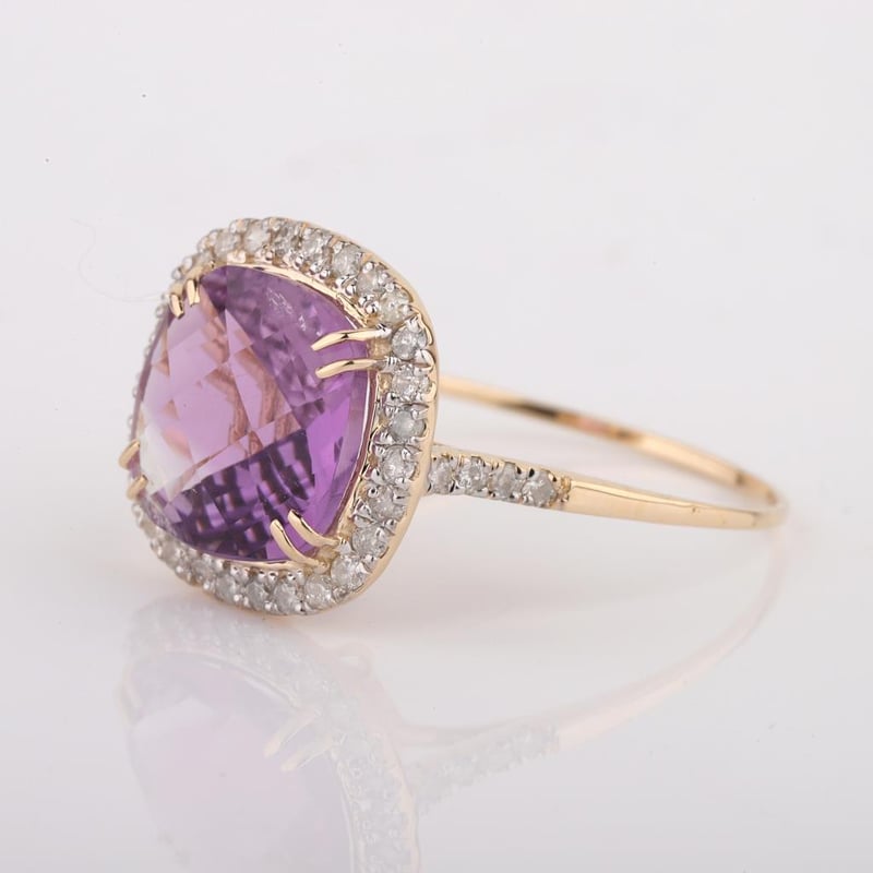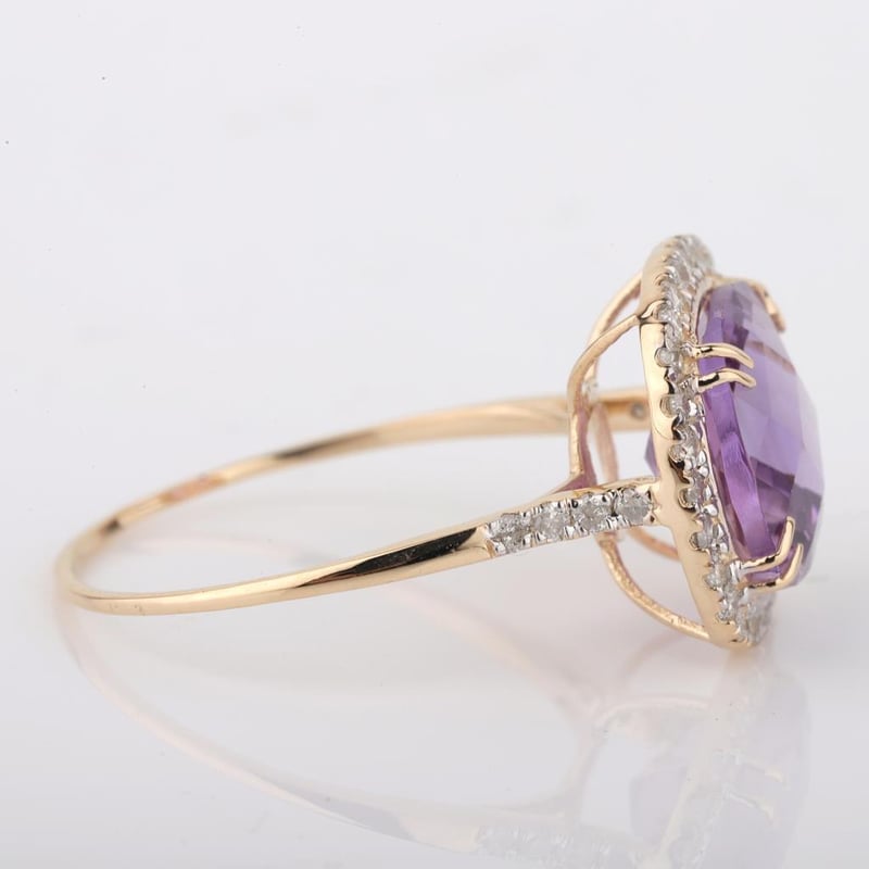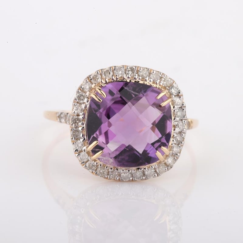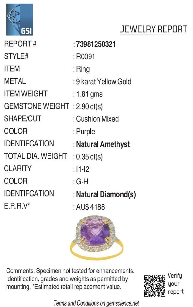 9CT YELLOW GOLD NATURAL AMETHYST & DIAMOND RING WITH VALUATION Weight Of The Item: 1.81 GFineness Of Metal(S): Yellow Gold 9KtThe Ring Consists Of (1) Cushion Brilliant Natural Amethyst. Surrounding The Main Stones Are Round Brilliant Cut Natural Diamonds.Antique StyleIdentification: Natural AmethystColor: PurpleShape: Cushion Brilliant CutNo. Of Stone: 1Dimension: 10 Mm X 10 Mm X 6 MmWeight: 2.9 CaratsCut: Very GoodIdentification: Natural DiamondShape: Round Brilliant CutWeight: 0.35 CtsCut: ExcellentCondition: Brand New (Unsold Jewellery Store Stock) Refer To Gemmologist Report For Further Grading Notes Accompanied By Gemmologist Report Issued By Gemological Science International (Gsi).Replacement Retail Value:$4188 Markings: 9ct Condition: Good - Refer Images 0488580+31