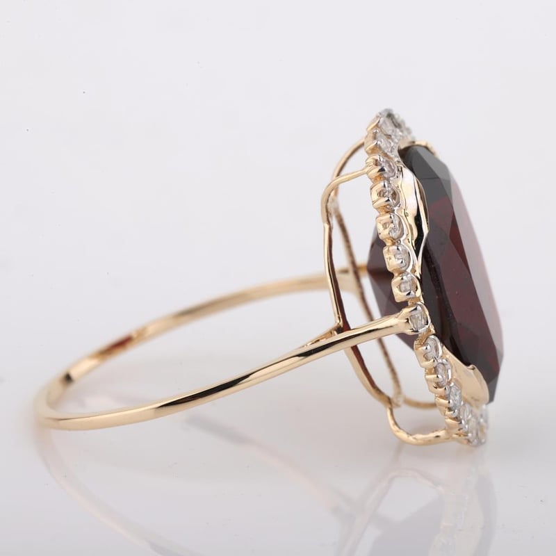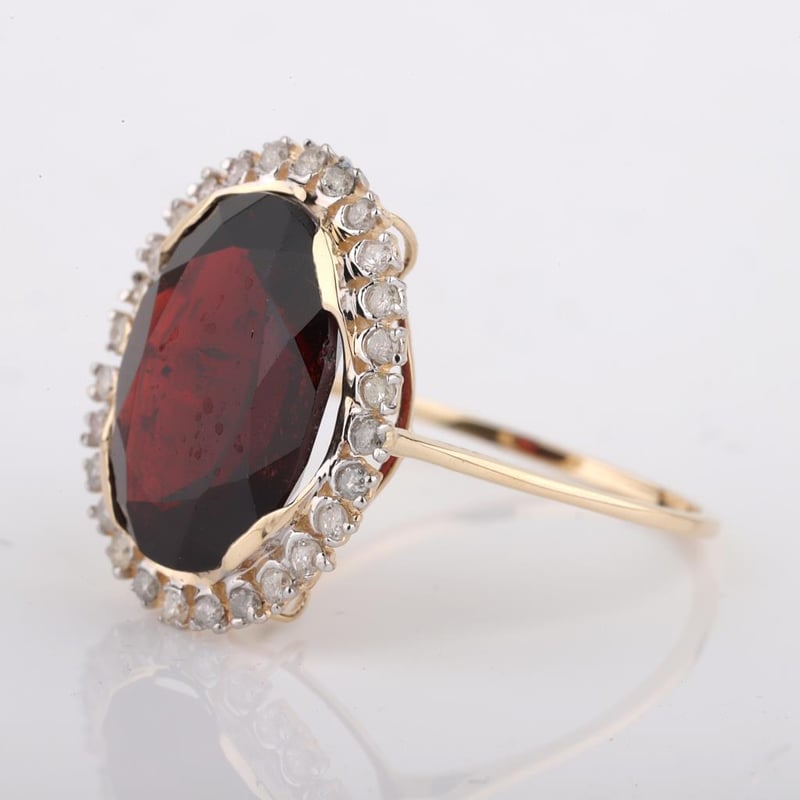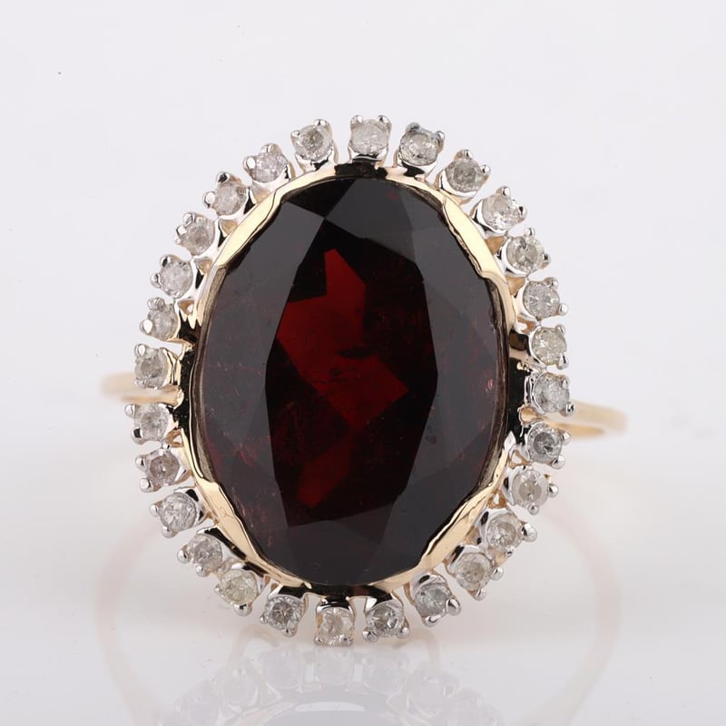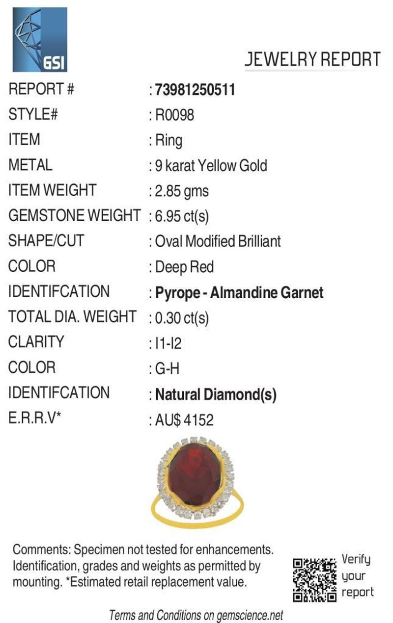 9CT YELLOW GOLD NATURAL GARNET & DIAMOND RING WITH VALUATION Weight Of The Item: 2.85 GFineness Of Metal(S): Yellow Gold 9KtThe Ring Consists Of (1) Oval Brilliant Natural Garnet. Surrounding The Main Stones Are Round Brilliant Cut Natural Diamonds.Antique StyleIdentification: Natural GarnetColor: RedShape: Oval Brilliant CutNo. Of Stone: 1Dimension: 14 Mm X 10 Mm X 8.4 MmWeight: 6.95 CaratsCut: Very GoodIdentification: Natural DiamondShape: Round Brilliant CutWeight: 0.3 CtsCut: ExcellentCondition: Brand New (Unsold Jewellery Store Stock) Refer To Gemmologist Report For Further Grading Notes Accompanied By Gemmologist Report Issued By Gemological Science International (Gsi).Replacement Retail Value:$4152 Markings: 9ct Condition: Good - Refer Images 0488580+53