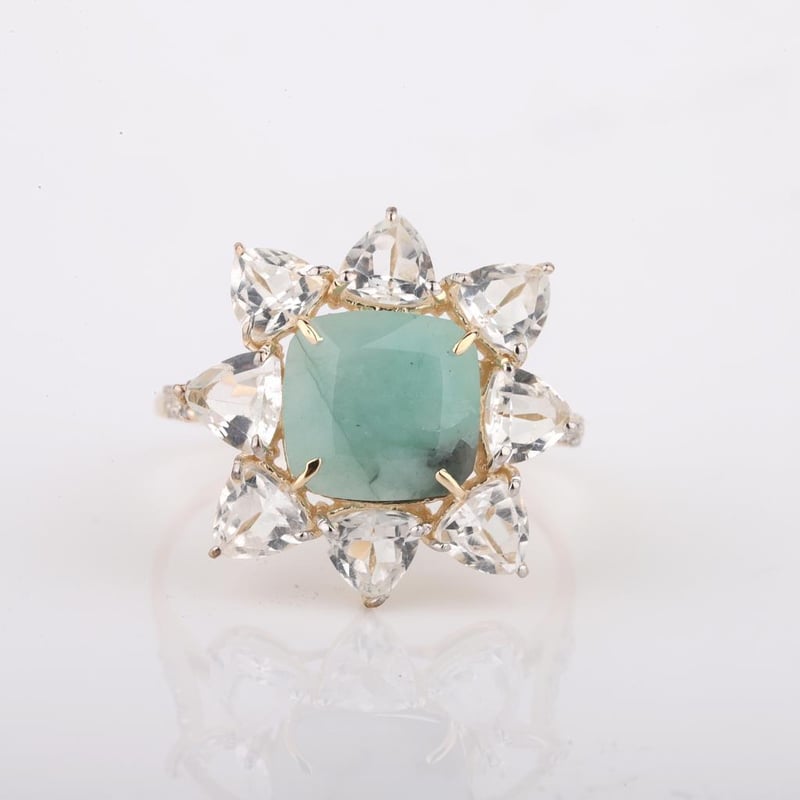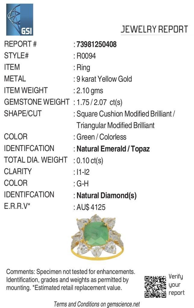 9CT YELLOW GOLD NATURAL EMERALD / NATURAL WHITE TOPAZ & DIAMOND RING WITH VALUATION Weight Of The Item: 2.09 GFineness Of Metal(S): Yellow Gold 9KtThe Ring Consists Of (1) Cushion Brilliant Natural Emerald & (8) Trillion Brilliant Cut White Topaz. Surrounding The Main Stones Are Round Brilliant Cut Natural Diamonds.Antique StyleIdentification: Natural Emerald / Natural White TopazColor: Green / WhiteShape: Cushion Brilliant Cut / Trillion Faceted CutNo. Of Stone: 9Dimension: 8 Mm X 8 Mm X 4.8 MmWeight: 1.75 Carats / 2.07 CaratsCut: Very GoodIdentification: Natural DiamondShape: Round Brilliant CutWeight: 0.1 CtsCut: ExcellentCondition: Brand New (Unsold Jewellery Store Stock) Refer To Gemmologist Report For Further Grading Notes Accompanied By Gemmologist Report Issued By Gemological Science International (Gsi).Replacement Retail Value:$4125 Markings: 9ct Condition: Good - Refer Images 0488580+37