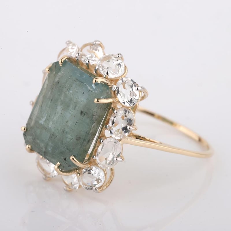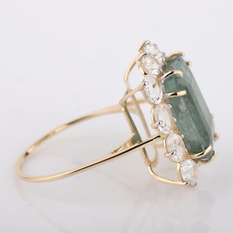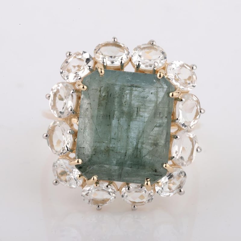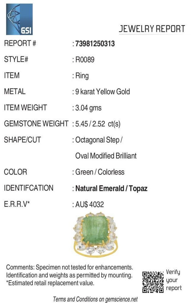 9CT YELLOW GOLD NATURAL EMERALD / NATURAL WHITE TOPAZ RING WITH VALUATION Weight Of The Item: 3.04 GFineness Of Metal(S): Yellow Gold 9KtThe Ring Consists Of (1) Octagon Step Natural Emerald & (12) Oval Brilliant Cut White Topaz.Antique StyleIdentification: Natural Emerald / Natural White TopazColor: Green / WhiteShape: Octagon Step Cut / Oval Faceted CutNo. Of Stone: 13Dimension: 12 Mm X 10 Mm X 7.2 MmWeight: 5.45 Carats / 2.52 CaratsCut: Very GoodCondition: Brand New (Unsold Jewellery Store Stock) Refer To Gemmologist Report For Further Grading Notes Accompanied By Gemmologist Report Issued By Gemological Science International (Gsi).Replacement Retail Value:$4032 Markings: 9ct Condition: Good - Refer Images 0488580+27
