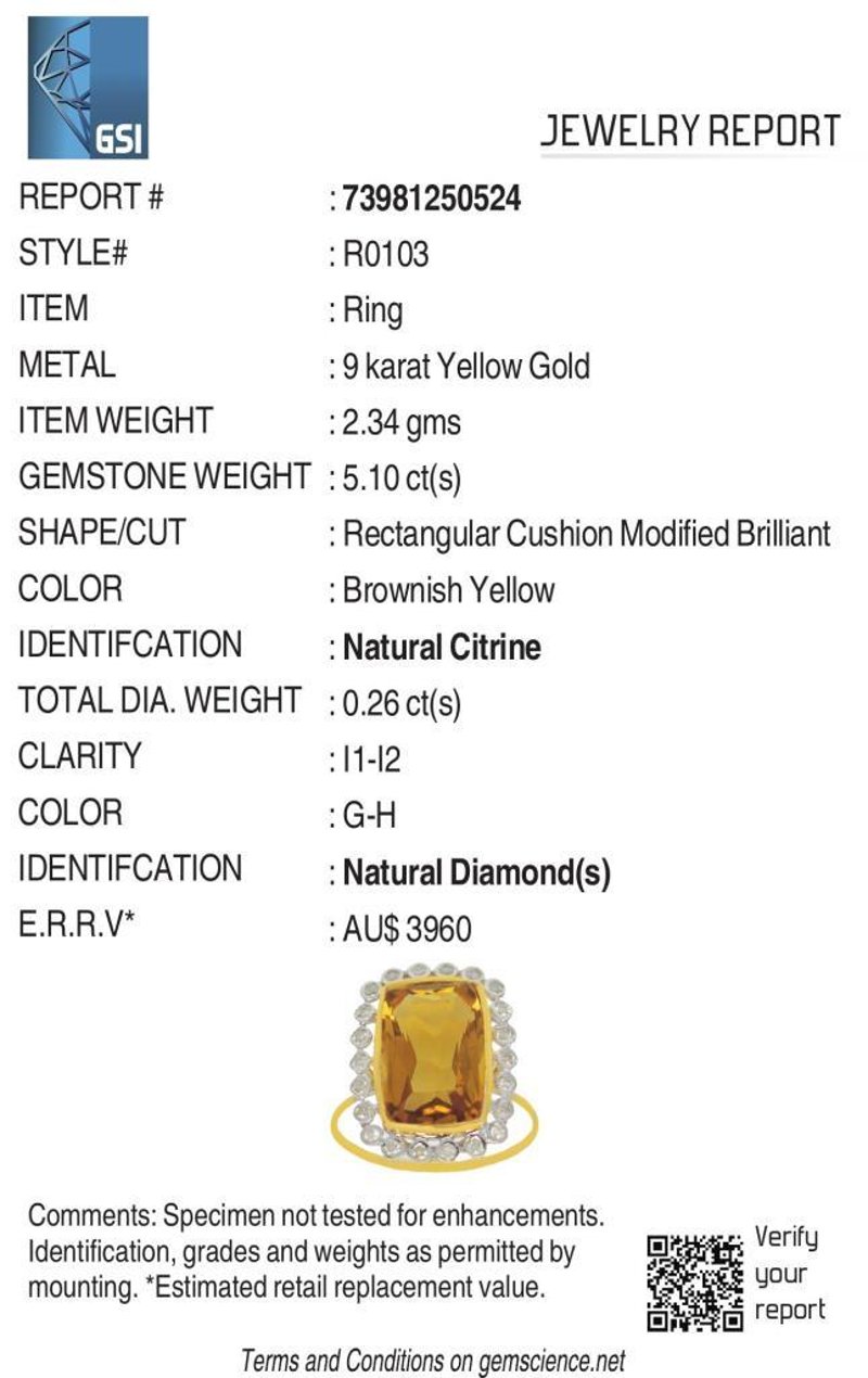 9CT YELLOW GOLD NATURAL CITRINE & DIAMOND RING WITH VALUATION Weight Of The Item: 2.34 GFineness Of Metal(S): Yellow Gold 9KtThe Ring Consists Of (1) Cushion Brilliant Natural Citrine. Surrounding The Main Stones Are Round Brilliant Cut Natural Diamonds.Antique StyleIdentification: Natural CitrineColor: YellowShape: Cushion Brilliant CutNo. Of Stone: 1Dimension: 14 Mm X 9 Mm X 8.4 MmWeight: 5.1 CaratsCut: Very GoodIdentification: Natural DiamondShape: Round Brilliant CutWeight: 0.26 CtsCut: ExcellentCondition: Brand New (Unsold Jewellery Store Stock) Refer To Gemmologist Report For Further Grading Notes Accompanied By Gemmologist Report Issued By Gemological Science International (Gsi).Replacement Retail Value:$3960 Markings: 9ct Condition: Good - Refer Images 0488580+60