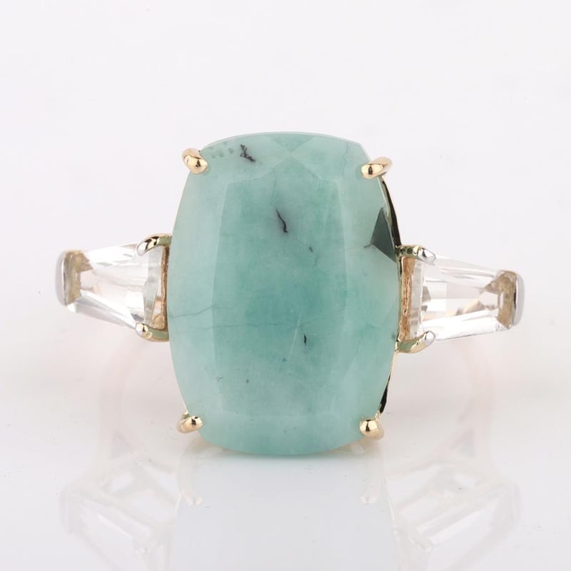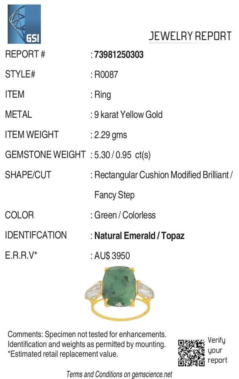 9CT YELLOW GOLD NATURAL EMERALD / NATURAL WHITE TOPAZ RING WITH VALUATION Weight Of The Item: 2.29 GFineness Of Metal(S): Yellow Gold 9KtThe Ring Consists Of (1) Cushion Brilliant Natural Emerald & (2) Baguette Brilliant Cut White Topaz.Antique StyleIdentification: Natural Emerald / Natural White TopazColor: Green / WhiteShape: Cushion Brilliant Cut / Baguette Faceted CutNo. Of Stone: 3Dimension: 14 Mm X 10 Mm X 8.4 MmWeight: 5.3 Carats / 0.95 CaratsCut: Very GoodCondition: Brand New (Unsold Jewellery Store Stock) Refer To Gemmologist Report For Further Grading Notes Accompanied By Gemmologist Report Issued By Gemological Science International (Gsi).Replacement Retail Value:$3950 Markings: 9ct Condition: Good - Refer Images 0488580+20