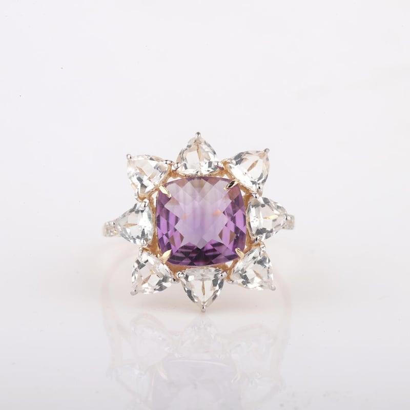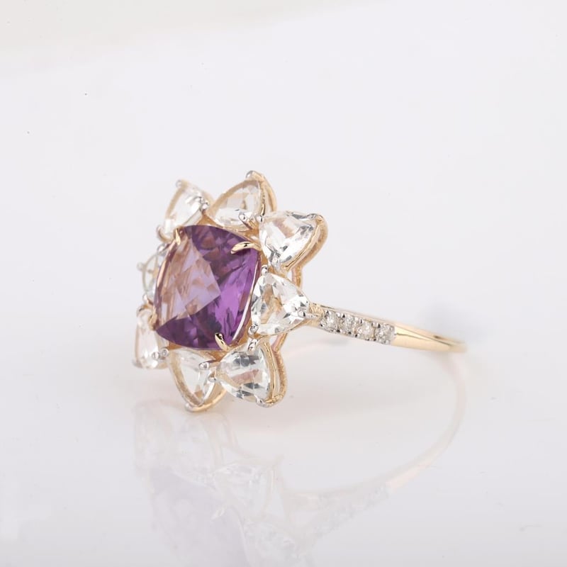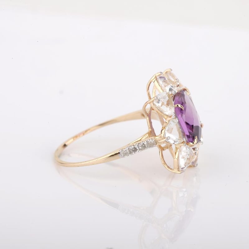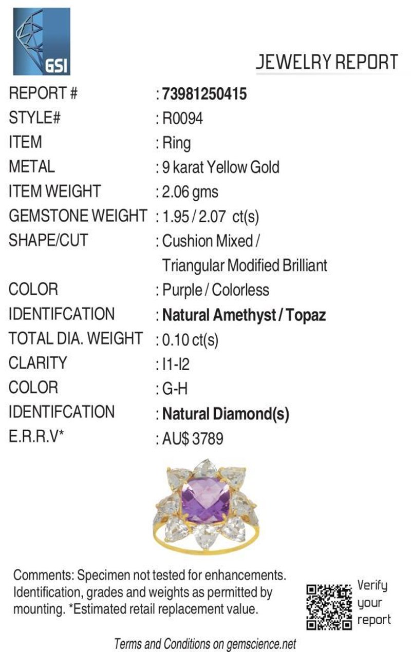 9CT YELLOW GOLD NATURAL AMETHYST / NATURAL WHITE TOPAZ & DIAMOND RING WITH VALUATION Weight Of The Item: 2.06 GFineness Of Metal(S): Yellow Gold 9KtThe Ring Consists Of (1) Cushion Brilliant Natural Amethyst & (8) Trillion Brilliant Cut White Topaz. Surrounding The Main Stones Are Round Brilliant Cut Natural Diamonds.Antique StyleIdentification: Natural Amethyst / Natural White TopazColor: Purple / WhiteShape: Cushion Brilliant Cut / Trillion Faceted CutNo. Of Stone: 9Dimension: 8 Mm X 8 Mm X 4.8 MmWeight: 1.95 Carats / 2.07 CaratsCut: Very GoodIdentification: Natural DiamondShape: Round Brilliant CutWeight: 0.1 CtsCut: ExcellentCondition: Brand New (Unsold Jewellery Store Stock) Refer To Gemmologist Report For Further Grading Notes Accompanied By Gemmologist Report Issued By Gemological Science International (Gsi).Replacement Retail Value:$3789 Markings: 9ct Condition: Good - Refer Images 0488580+41