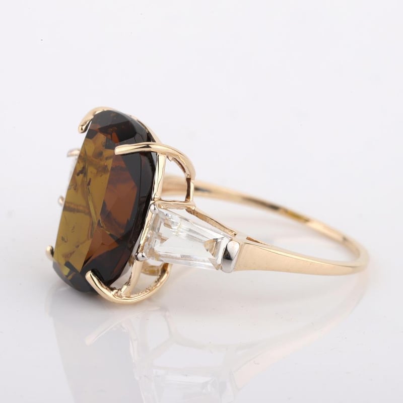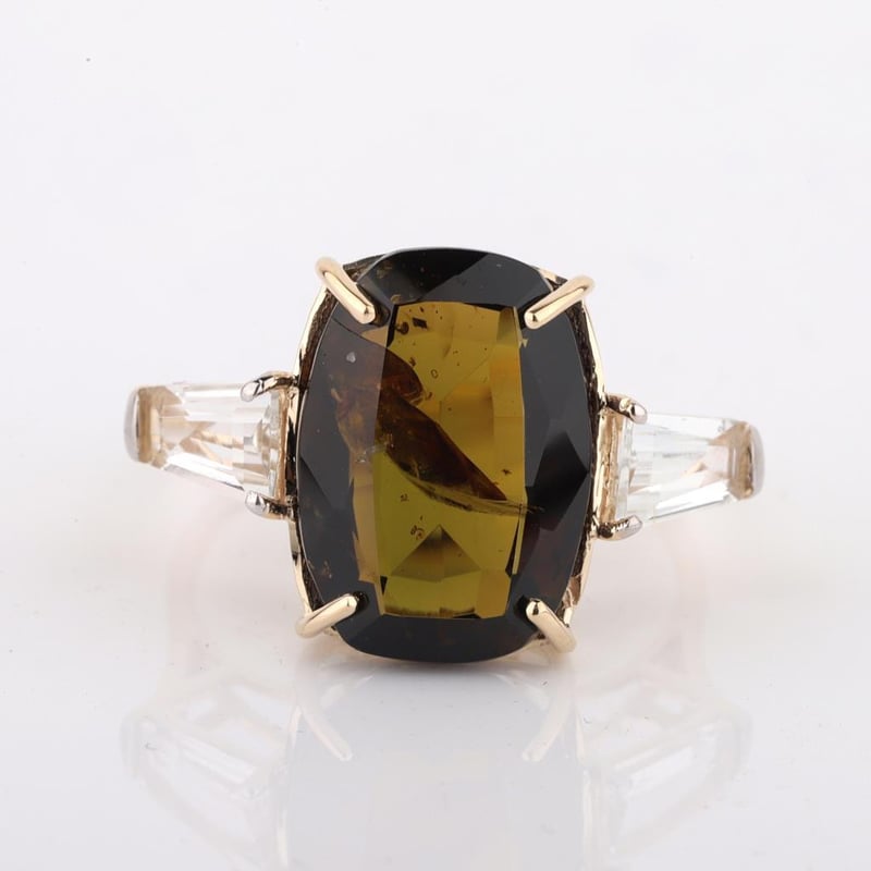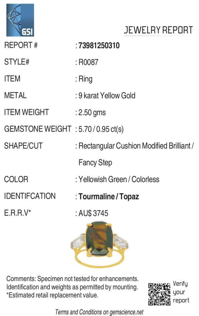 9CT YELLOW GOLD NATURAL TOURMALINE / NATURAL WHITE TOPAZ RING WITH VALUATION Weight Of The Item: 2.5 GFineness Of Metal(S): Yellow Gold 9KtThe Ring Consists Of (1) Cushion Brilliant Natural Tourmaline & (2) Baguette Brilliant Cut White Topaz.Antique StyleIdentification: Natural Tourmaline / Natural White TopazColor: Green / WhiteShape: Cushion Brilliant Cut / Baguette Faceted CutNo. Of Stone: 3Dimension: 14 Mm X 10 Mm X 8.4 MmWeight: 5.7 Carats / 0.95 CaratsCut: Very GoodCondition: Brand New (Unsold Jewellery Store Stock) Refer To Gemmologist Report For Further Grading Notes Accompanied By Gemmologist Report Issued By Gemological Science International (Gsi).Replacement Retail Value:$3745 Markings: 9ct Condition: Good - Refer Images 0488580+25